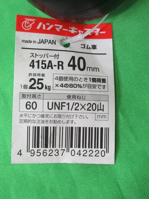 8個セット 未使用 ハンマーキャスター 415A-R ストッパー付ゴム車 40mm 許容荷重25kg 車輪 アウトレット