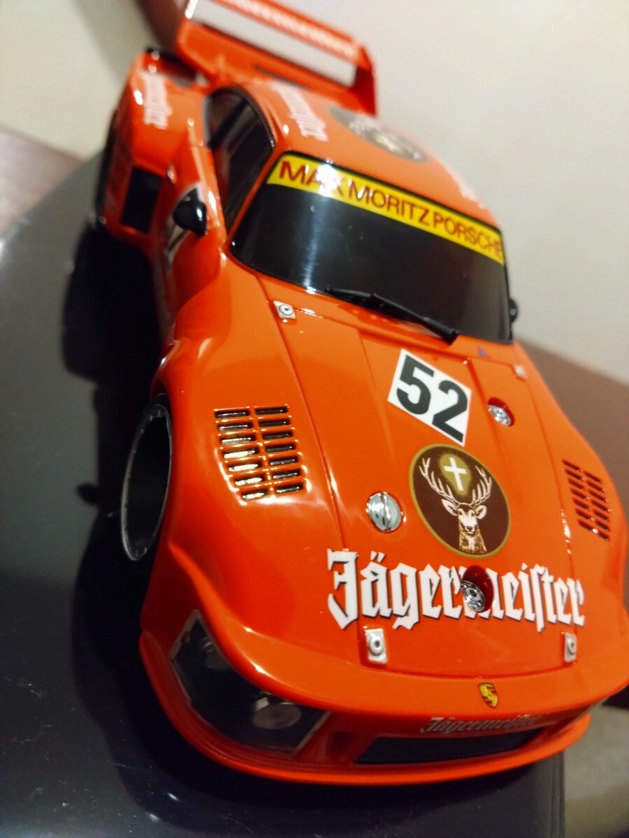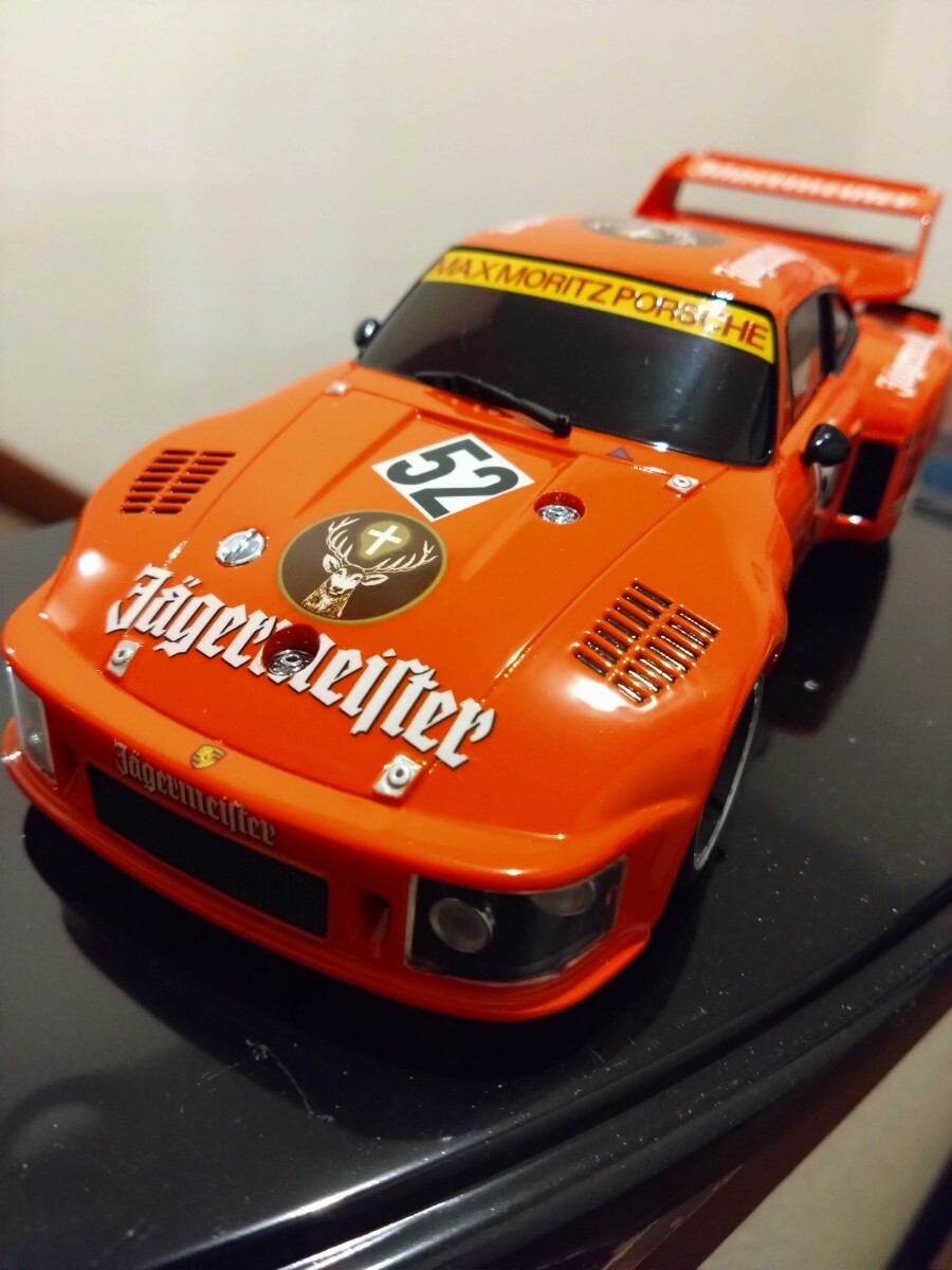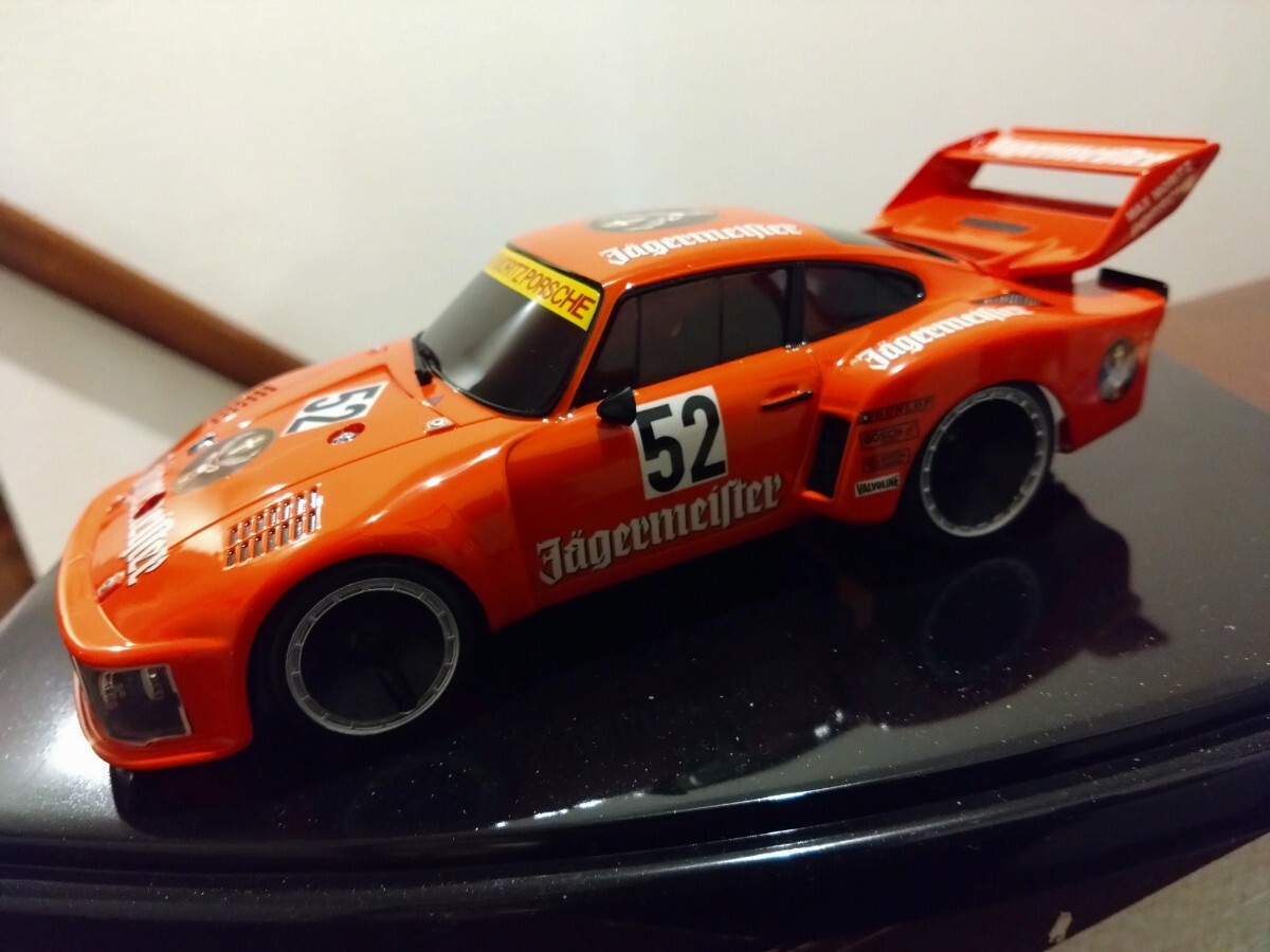 こちらはKyosho Mini-Z用の1/28スケールボディシェル、Porsche 935 Turbo 1977 Jgermeister #52です。ポリカーボネート製で光沢仕上げが施され、オレンジのボディにJgermeisterロゴと#52ナンバーが特徴的です。ボディ長さ約13-15cm、ホイールベース94mmで、MR-015RM、MR-02、MR-03、MR-04などのRWDシャーシに高い互換性があります(AWDシャーシは調整が必要)。レースカーのリアルなデザインを再現したコレクターアイテムです。