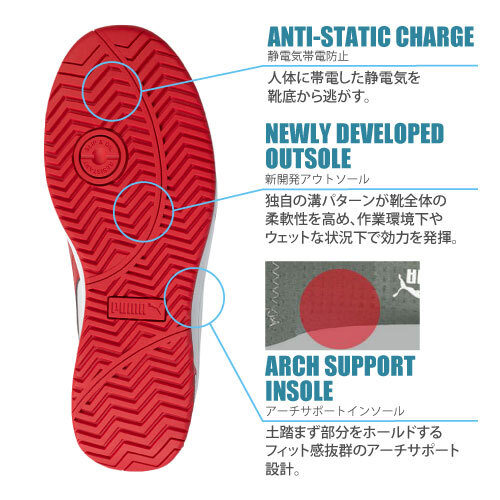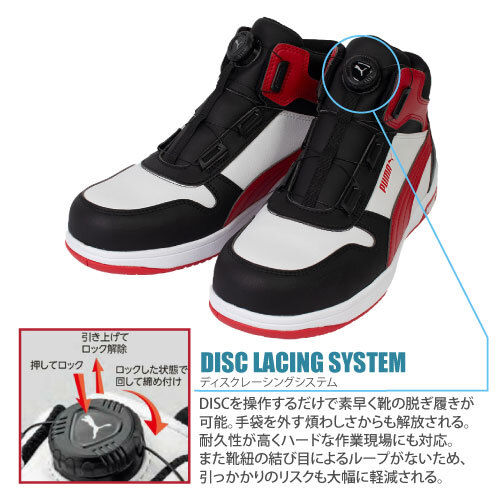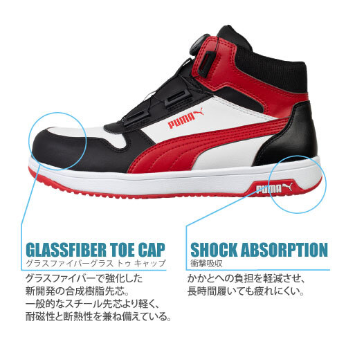 | ◆その他PUMAの安全靴はこちらから ■特 長■ ・JSAA規格A種認定品 ・DISCを操作するだけで素早く靴の脱ぎ履きが可能 手袋を外す煩わしさからも解放される ・耐久性が高くハードな作業現場にも対応 また靴紐の結び目によるループがないため、 引っかかりのリスクも大幅に軽減される ・グラスファイバーで強化した新開発の合成樹脂先芯 一般的なスチール先芯より軽く、 耐磁性と断熱性を兼ね備えている ・かかとへの負担を軽減させ、 長時間履いても疲れにくい ・人体に帯電した静電気を靴底から逃がす ・独自の溝パターンが靴全体の柔軟性を高め、 作業環境下やウェットな状況下で効力を発揮 ・土踏まず部分をホールドする フィット感抜群のアーチサポート設計 ■用 途■ 工場・現場作業・工事現場など ■素 材■ アッパー:人工皮革(マイクロファイバー) ソール:合成底 先 芯:グラスファイバー強化合成樹脂 ■カラー■ (63.212.0)ブラック×ホワイト×レッド ■サイズ■ 26.0cm ■靴 幅■ 3E ■重 量■ 約410g(26.0cm片足) |