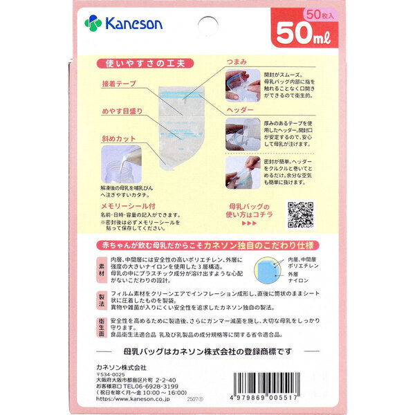 多くの助産院でご愛用。 衛生的に母乳を冷凍・冷蔵保存! 多くの病産院・NICU(新生児集中治療室)で愛用。 お母さんがさく乳してくれた大切な母乳とその想いをしっかりと赤ちゃんに届けます 昭和大学医学部小児科学講座 主任教授 水野克己先生推奨! ・赤ちゃんが飲む母乳だからこそカネソン独自のこだわり仕様。 ・素材:内層、中間層には安全性の高いポリエチレン、外層に強度の大きいナイロンを使用した3層構造。 母乳の中にプラスチック成分が溶け出すような心配がないこだわりの設計。 ・製法:フィルム素材をクリーンエアでインフレーション成形し、直後に筒状のままシート状に圧着したものを製袋。 異物や雑菌が入りにくい安全性を追求したカネソン独自の製法。 ・衛生面:安全性を高めるために製造後、さらにガンマー滅菌を施し、大切な母乳をしっかり守ります。 食品衛生法適合品、乳及び乳製品の成分等に関する省令適合品。 ・使いやすさの工夫。 ・つまみ:開封がスムーズ。 母乳バッグ内部に指を触れることなく口開きができるので衛生的。 ・ヘッダー:厚みのあるテープを使使用したヘッダー。 開封ロが安定するので安心して母乳が注げます。 密封が簡単。 ヘッダーをクルクルと巻いてとめるだけ。 余分な空気も簡単に抜けます。 ・接着テープ ・めやす目盛り ・斜めカット:解凍後の母乳を哺乳びんへ注ぎやすいカタチ。 ※密封後は必ずメモリーシールを貼って保存してください。 個装サイズ:110X165X55mm 個装重量:約179g 内容量:50mL×50枚入 製造国:日本 【発売元:カネソン株式会社】 【材質表示】 ナイロン/ポリエチレン 【耐冷温度】 -70度(衝撃を与えず安置した場合) 注意事項 ※予告なく成分・パッケージが変更になることがございます。 予めご了承ください。 *予告なく成分・パッケージが変更になることがございます。予めご了承ください *ダンボールを使用して発送する場合には、入数以下の個数の場合、 中古ダンボールを使用する場合があり、ご注文の商品とは異なるダンボールになる場合があります。 あらかじめ、ご了承ください。 |
