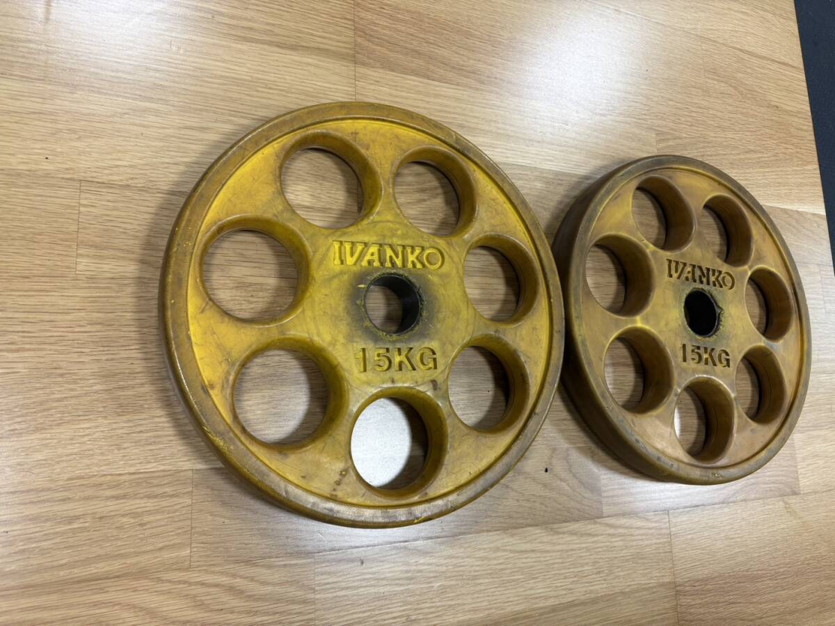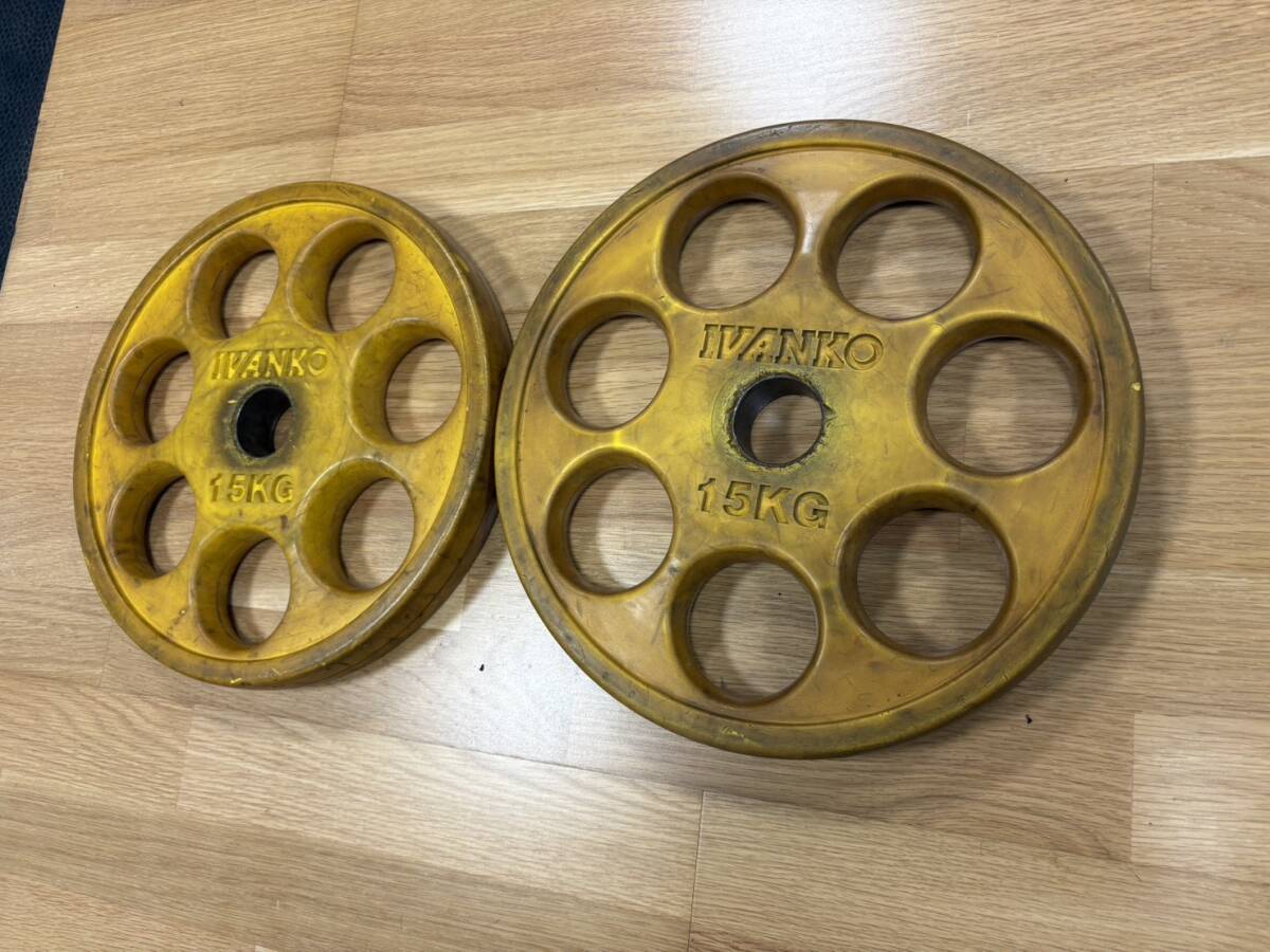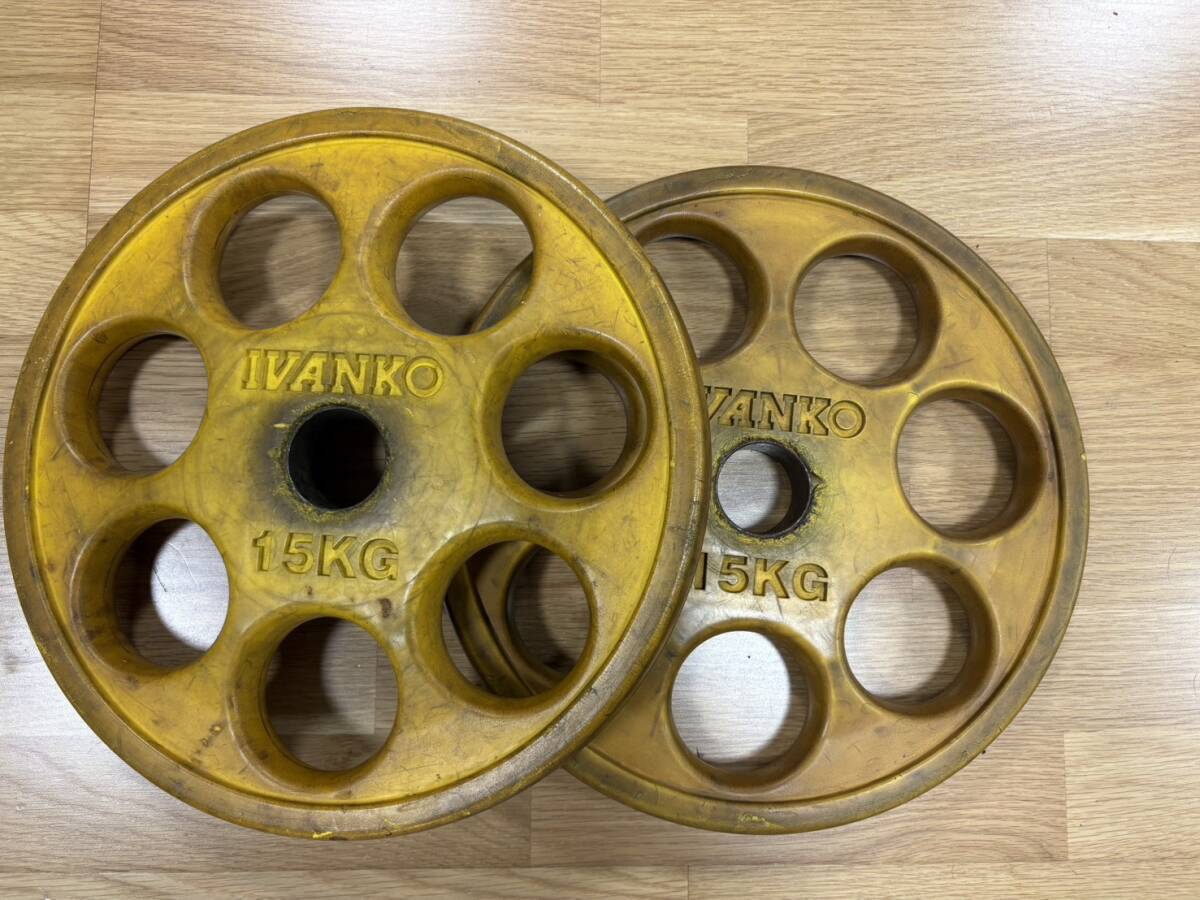 IVANKO イヴァンコ オリンピックプレートセット 15Kg×2/計30kg  の出品です。使用感有 傷もあります。ホームトレーニングには問題ないかと思いますので画像で状態判断して入札お願いします。大阪市からの出品です。送料はヤマト着払いを予定しています。引き取りもOKです。他のサイズも出品しています。梱包は簡易包装で発送いたします。