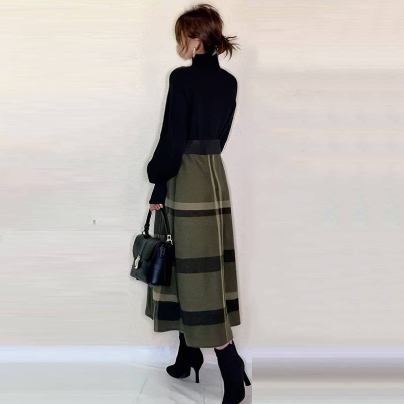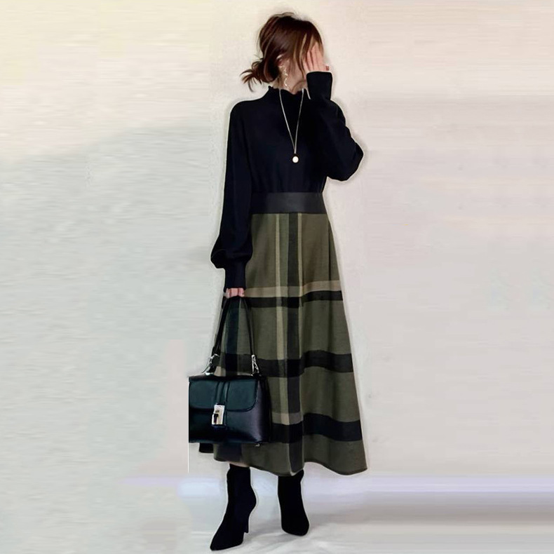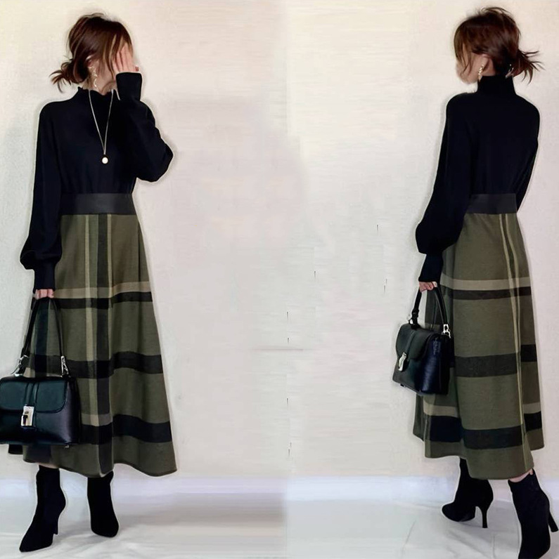 同梱1万円送料無料マキシワンピースロングワンピース ニットセーター チェック柄 ふんわり袖 ワンピース 大人 着やせ 通勤 オフィス 入園式