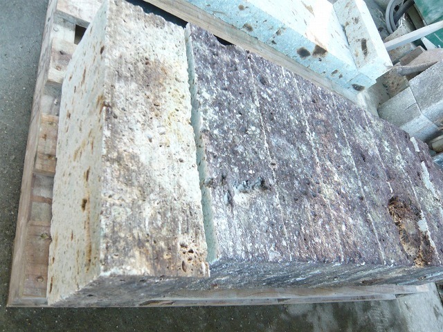 大谷石は、人にやさしい稀少な自然石 2級古大谷石の端材在庫特価品。 約150*100*300前後ミリ(数ミリのバラつき有、非直角)。 重さは1ケ約7.7キロと素人の方でもお気軽にご使用いただける風合あるお品物です。80ヶ1パレットセット価格(送料別)。 2級、在庫品のため写真のように黒ずんだ風合いの面、空洞化、欠け箇所もございます。 単品の場合は単価¥900税抜きとなります。メールにてお問い合わせ下さい。 耐火性があり見た目も素朴でやさしく、石としては軽いと話題の人気商品! パレット梱包費別途 大谷石は耐火性に優れ、ダニを寄せ付けず、 調湿効果、音響効果、アルファ波の継続放出の調査結果が観測されています。 また、日本の栃木県宇都宮市大谷、立岩、岩原地区でしか採れない 希少な石材でもあります。 近年、大谷石の知られざる魅力が注目され、様々なシーンで使用され 人に安らぎを与える優しいテクスチュアで、非常に人気を集めています。 送料・梱包費を含めたお見積りは、メールにてお問い合わせ下さい。 宅配便配送の際は荷降ろしお手伝いが必要です(時間指定不可、大抵午後着)。 ご不明な点は、お問い合わせください。 ◆サイズ◆ 特価品NEWピンコロ 約150×100×300mm前後 商品は在庫限りとさせていただきます。 実店舗も御座いますので、ご注文いただきました商品が在庫切れの場合は、 TEL、またはメールでご連絡差し上げます。 |