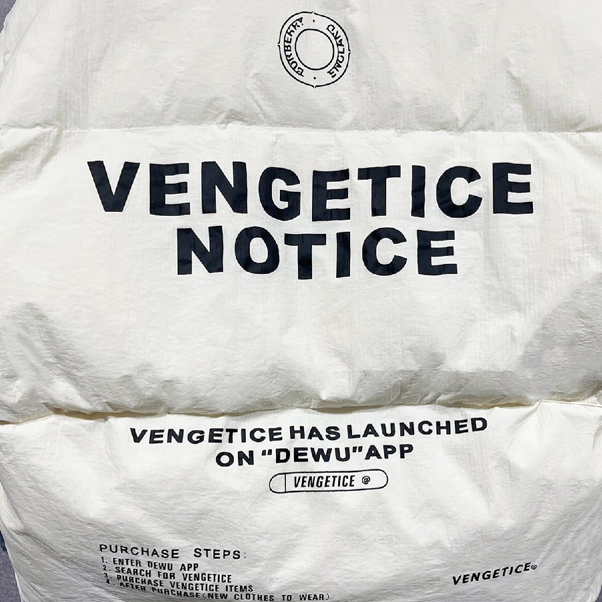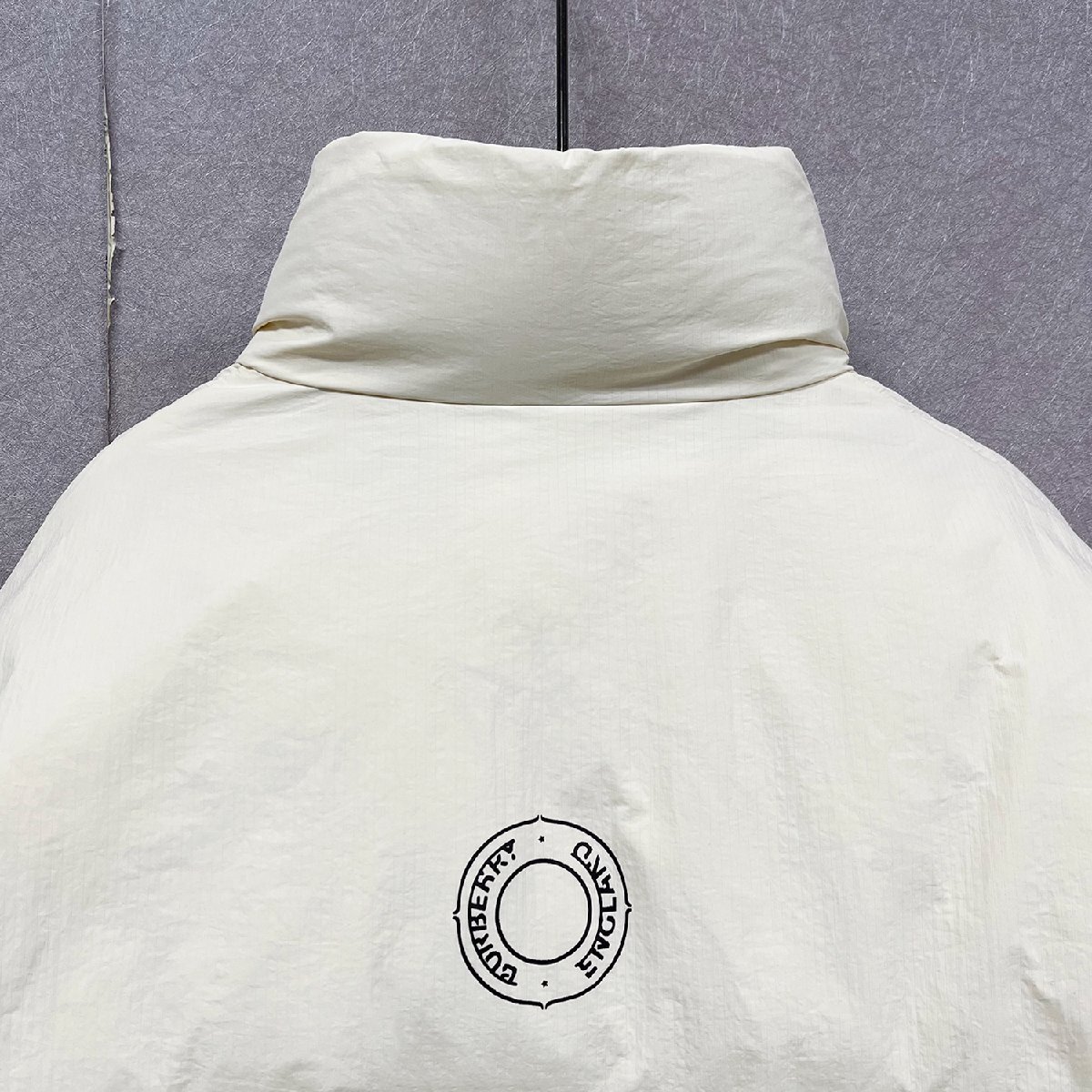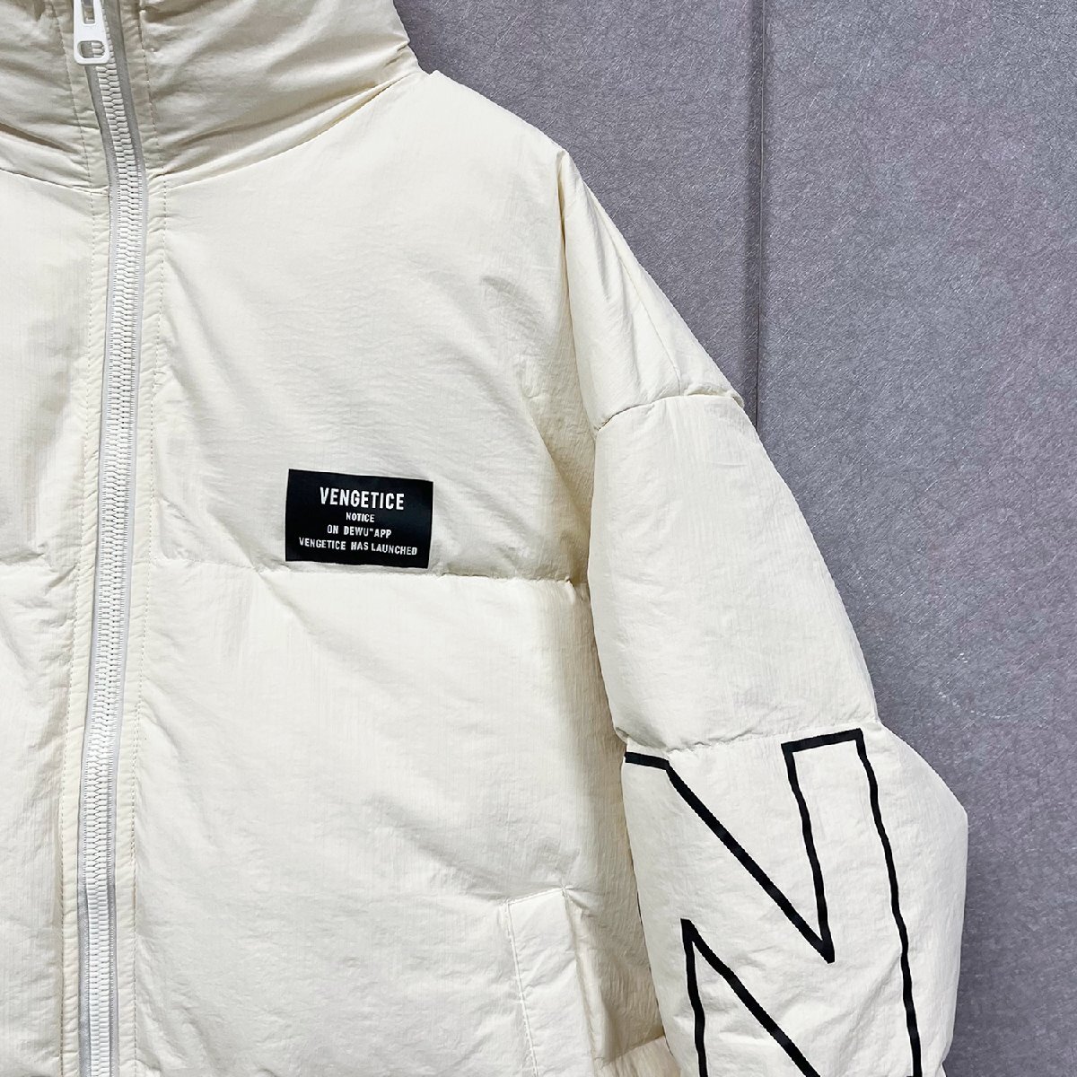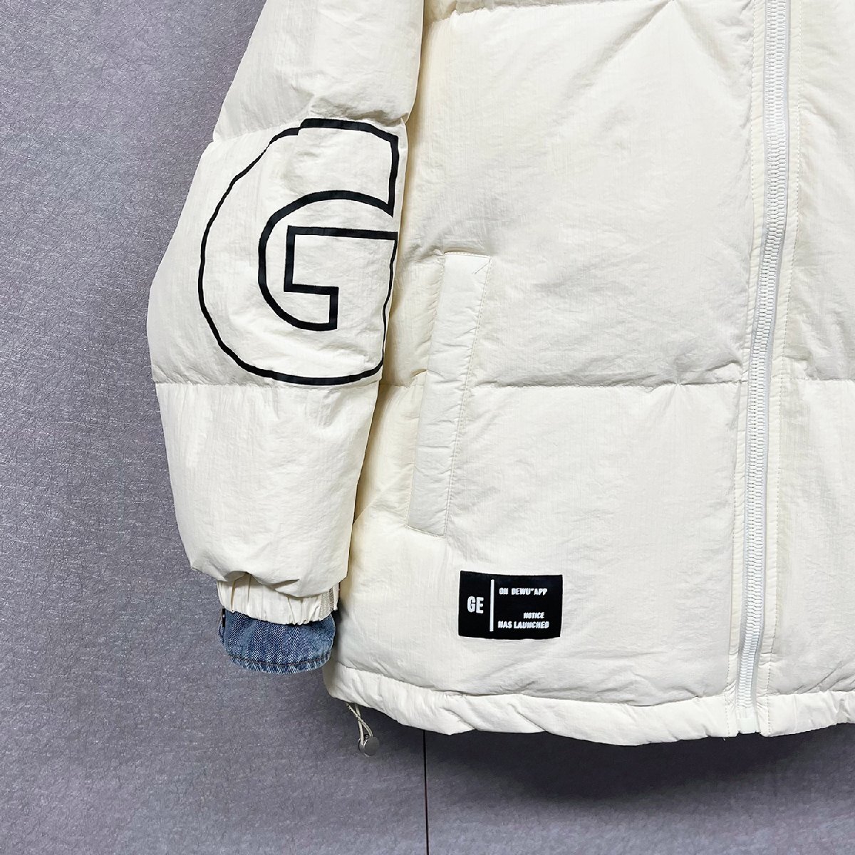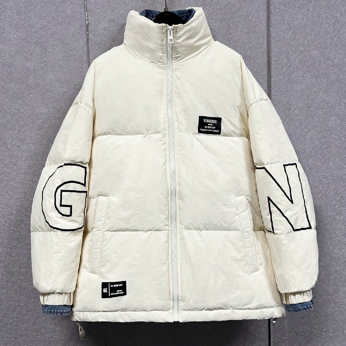 クラシックで現代スタイルの英字柄ダウンジャケット。
