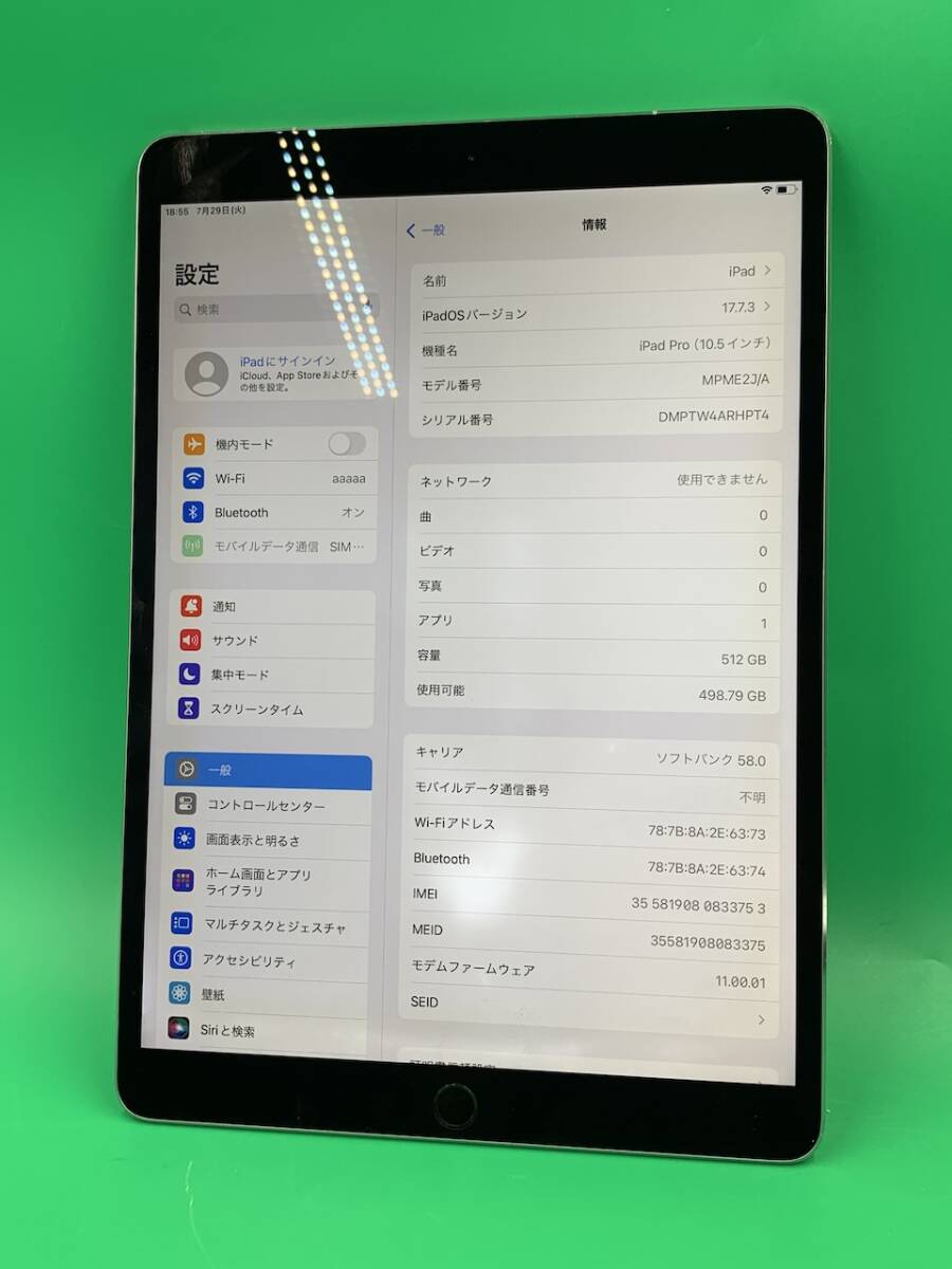 【商品名】iPad Pro 10.5インチ Wi-Fi+Cellular 【容量】512GB 【カラー】スペースグレイ 【型番】MPME2J/A 【バッテリー最大容量】83% 【アクティベーションロック】解除済み 【シリアル / IMEI】355819080833753 【SIMロック】解除済み 【キャリア】SoftBank 【利用制限】○ 【初期不良】商品到着後1週間 【付属品内容】 ★本体 ※その他注意事項: ♪液晶面:画面経年劣化で、やけ・変色ありますが、操作には影響がありません。 ♪本体状態:本体打痕ありますが、使用上には問題ありません。 通信含め、動作確認済みで、全て問題なく、使用できます。 【発送日程】当日または翌日(当日12時過ぎた場合は翌日になります。) 【発送方法】2、ヤマト運輸コンパクト 【定休日】日曜日(土曜日12時以降、日曜日お支払いの場合は月曜日に発送致します。) 【管理番号】AJ120250729−GB0263 【免責事項】 1、写真はなるべく分かりやすいよう、傷、汚れなどを隠さず、正確な情報をお伝えしますが、 一部どうしても映れない傷、汚れがあるかもしれませんので、ご注意ください。 2、あくまで中古品ですので、多少の汚れ、細かい傷がございますので、神経質な方はご慎重にお考えください。 3、また、バッテリーは消耗品のため、保証の対象外となります。 | ||