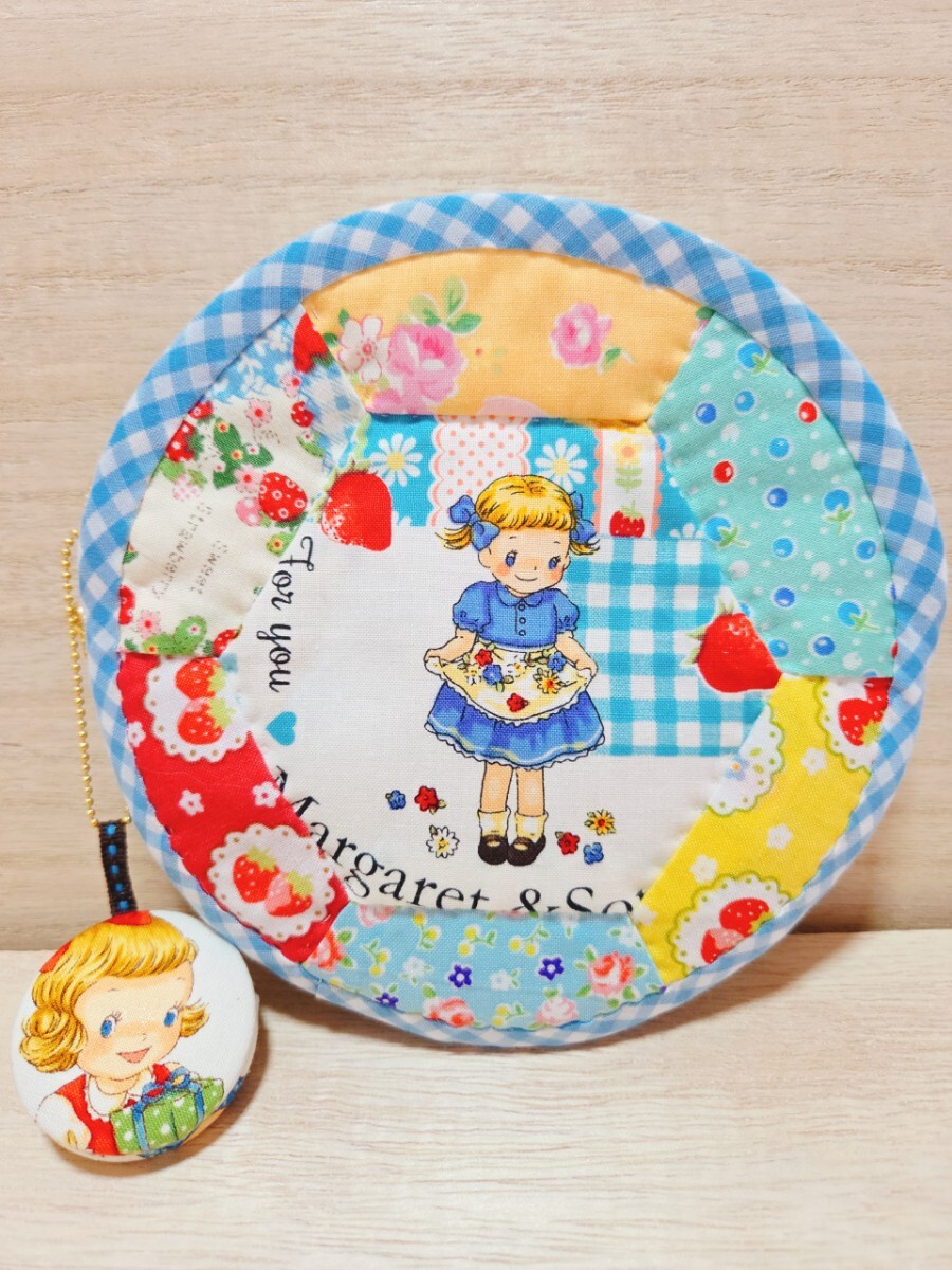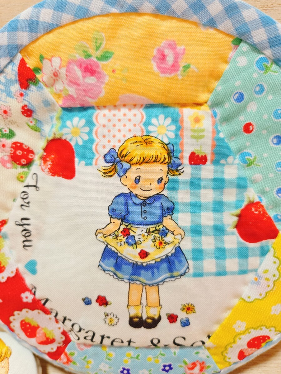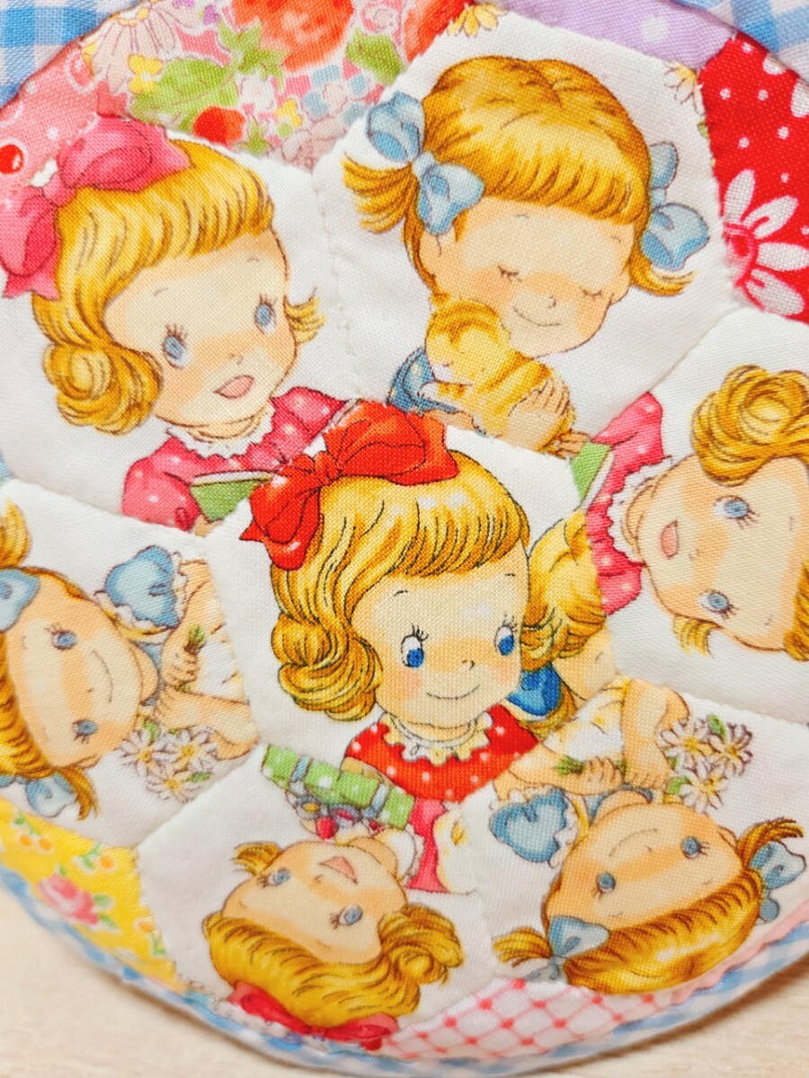 片面は、可愛いマーガレットソフィちゃんの生地で、ヘキサゴンパーツを作り、パッチワークしてポーチをお作りしました。もう片面は、可愛いソフィちゃんです。