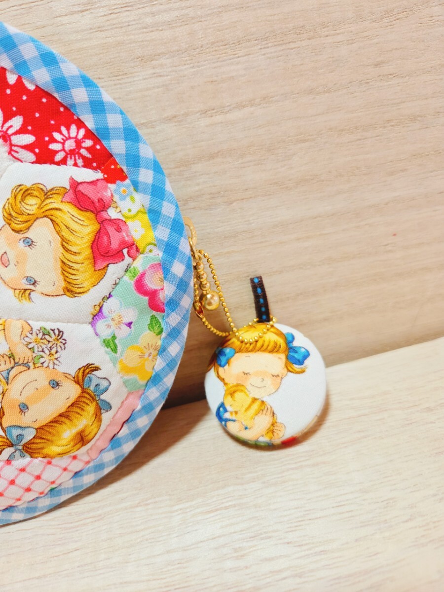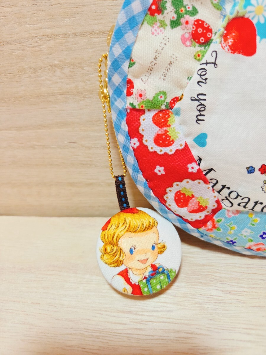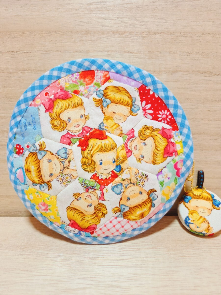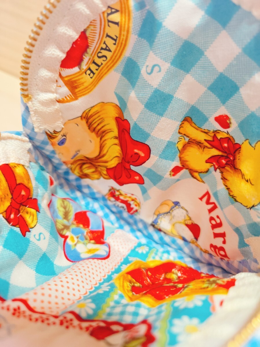 片面は、可愛いマーガレットソフィちゃんの生地で、ヘキサゴンパーツを作り、パッチワークしてポーチをお作りしました。もう片面は、可愛いソフィちゃんです。