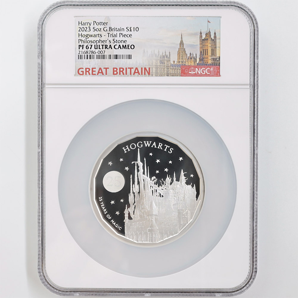 試鋳貨 2023 英国 ハリー・ポッター出版25周年 ホグワーツ魔法魔術学校 10ポンド 銀貨 5オンス プルーフ NGC PF 67 UC 最高鑑定