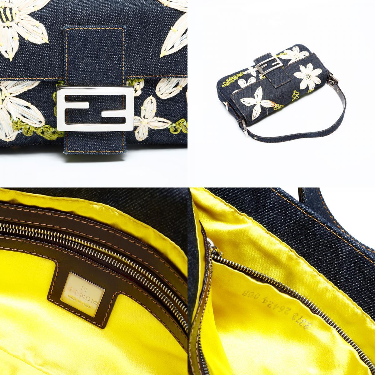 極美品 FENDI デニム フラワー刺繍 マンマバケット ハンドバッグ ネイビー