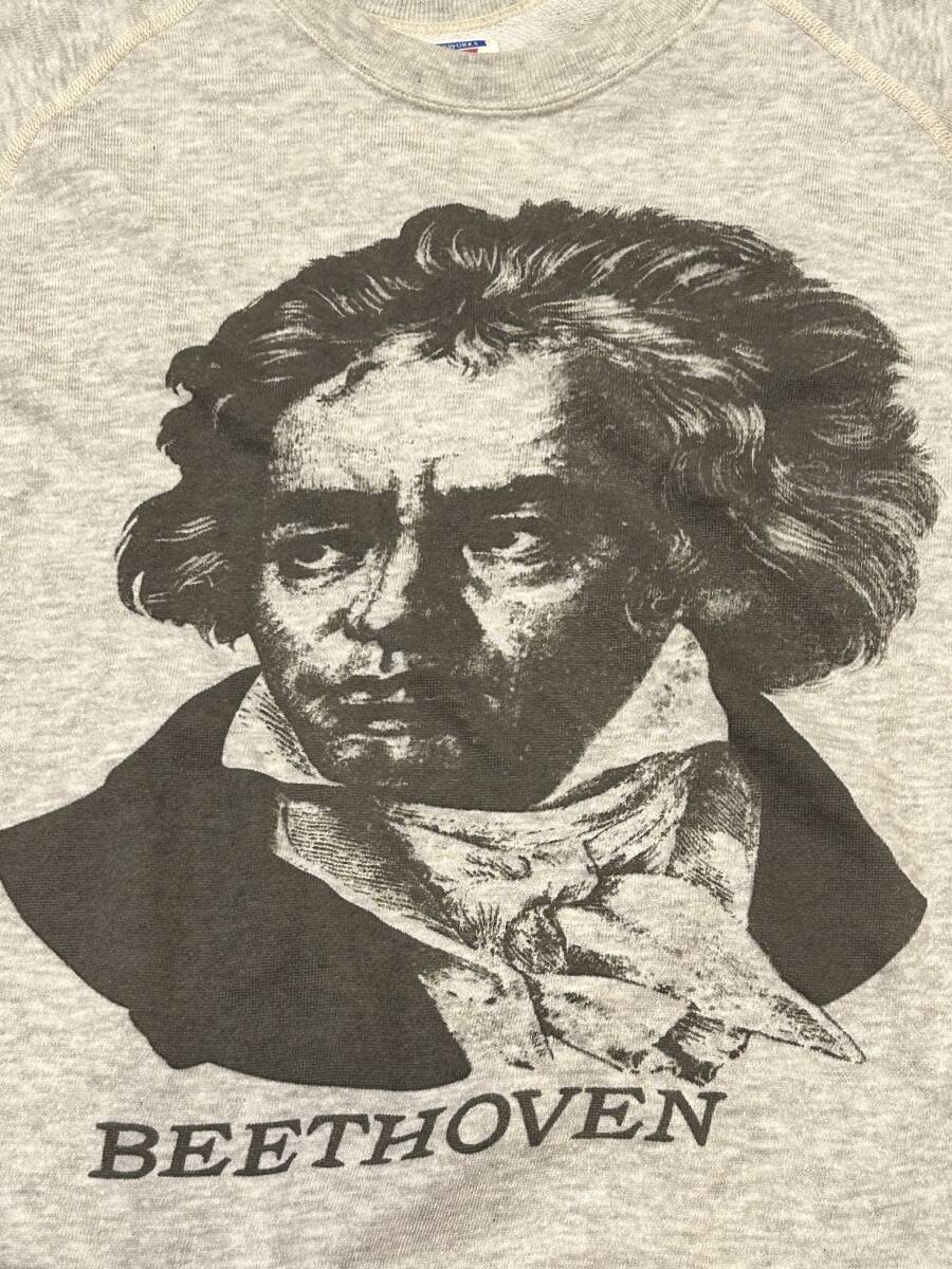 WAREHOUSE、DUBBLEWORKSのライトウェイト、スウェット。ベートーベンの染込プリント。表記サイズS、日本製、綿100%。身幅49cm、袖丈(脇下から袖先)48cm、後着丈58cm。ユーズドにつき、ノーリターン、ノークレームでお願いいたします。