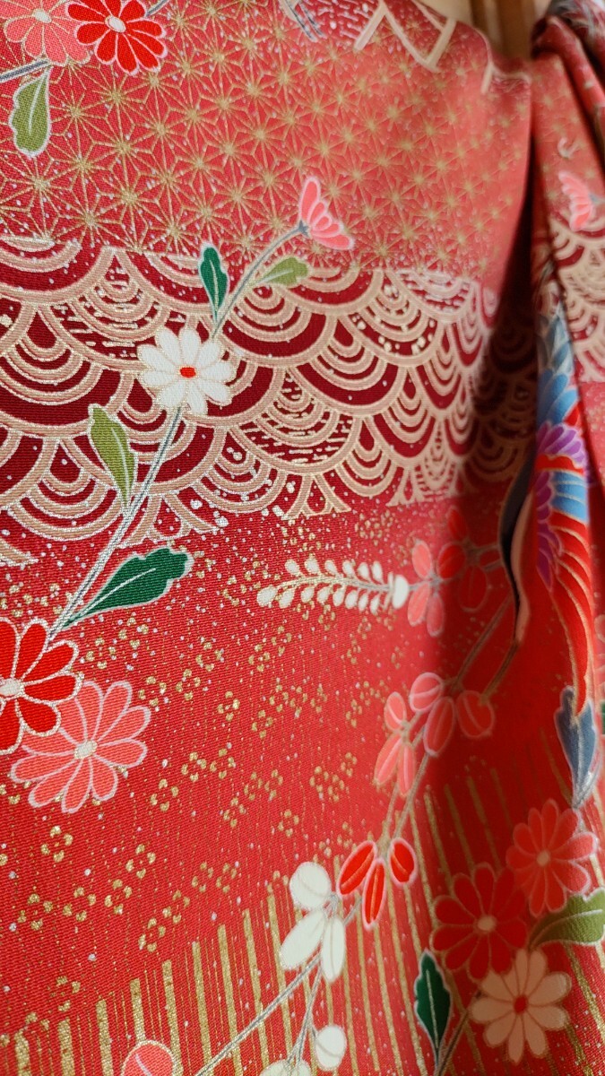 赤系地に網代や籠目等の吉祥文様に菊や鶴等の柄の十三参り向け着物です。