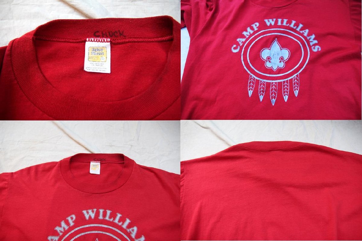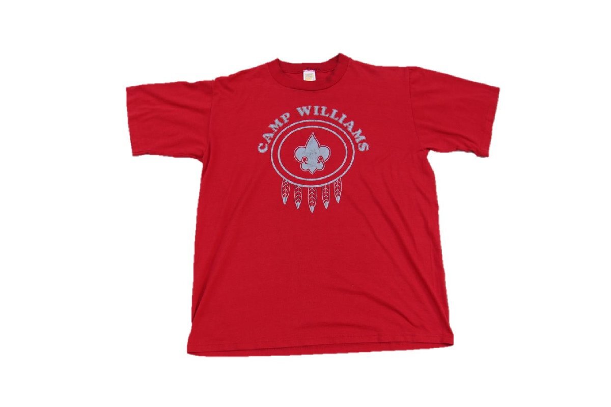 1980年代から90年代頃のVelva Sheen製の半袖プリントTシャツとなります。フロントのみのプリントで表記から恐らくArmy AcademyもしくはBoy Scout等のCamp Williamsの文字とボーイスカウト等で見られる百合の紋章がプリントされております。ベースは濃い目の赤でボディはコットンとポリエスターの混合素材となります。サイズはXLと人気の大き目サイズですので定番の白黒ベース以外のお色をお探しの方は是非ご検討下さい。