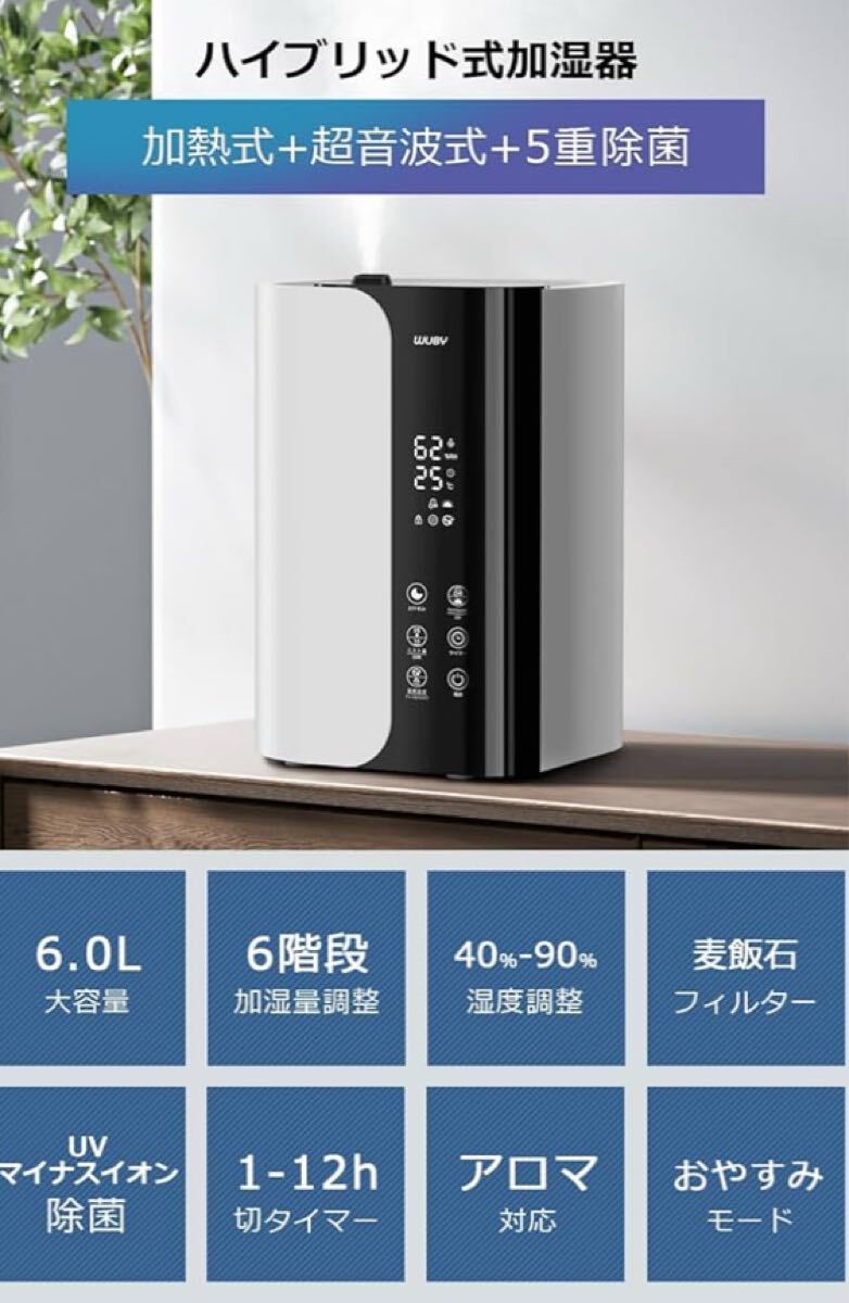 【6L大容量加湿器 多機能リモコン ハイブリッド加熱式】6Lの大容量タンクを備え、寝室やリビングはもちろん、広いオフィスにも対応可能。付属の多機能リモコンでは、電源のオン/オフに加え、マイナスイオン、湿度設定、ミスト量調整、タイマー、お休みモード、UV除菌、加熱機能まで操作できます。加熱機能を選択すると、温かい霧が噴出され、より効果的な除菌が可能です。