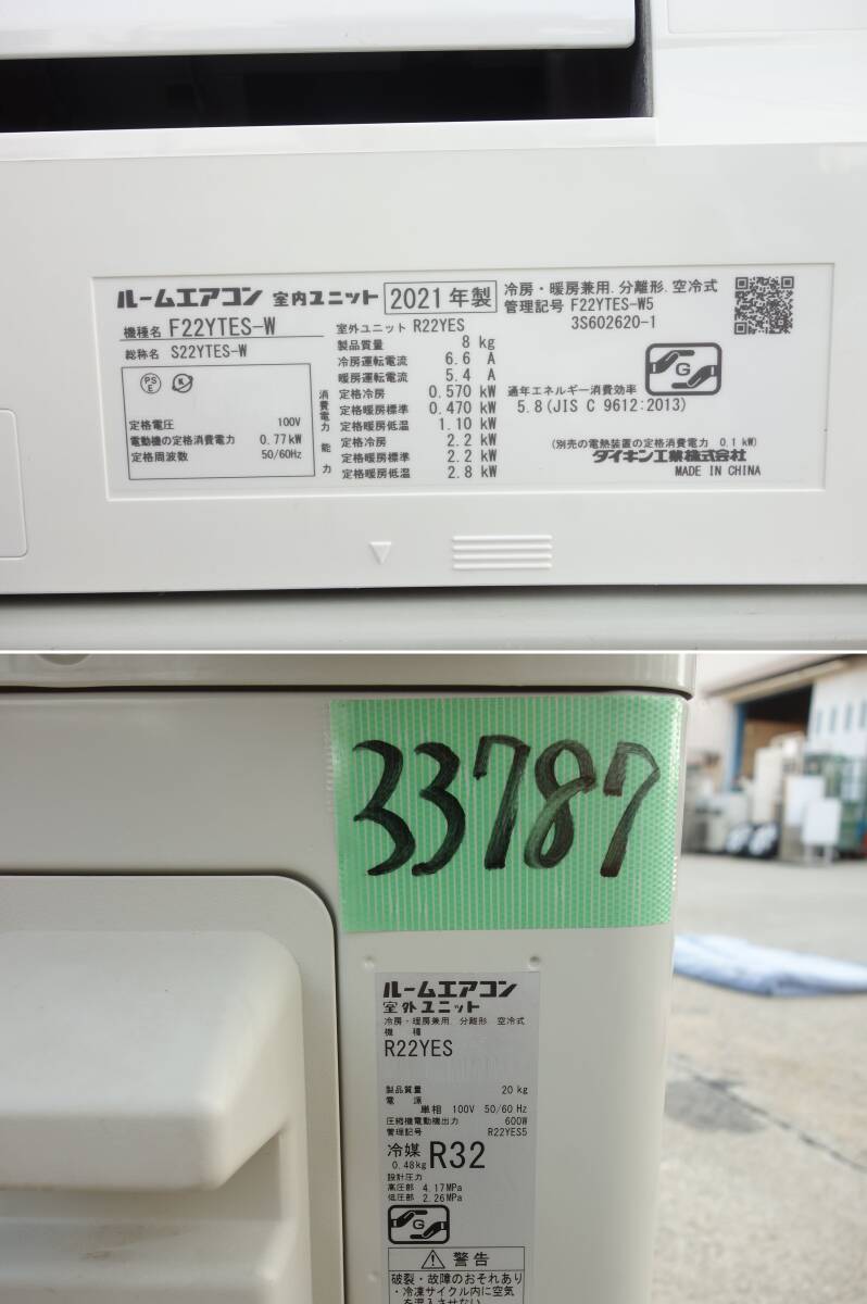 【中古】M▽即決 ダイキン ルームエアコン 2021年 2.2kw ~8畳 光速ストリーマ搭載 標準モデル コンパクトタイプ F22YTES (33787)