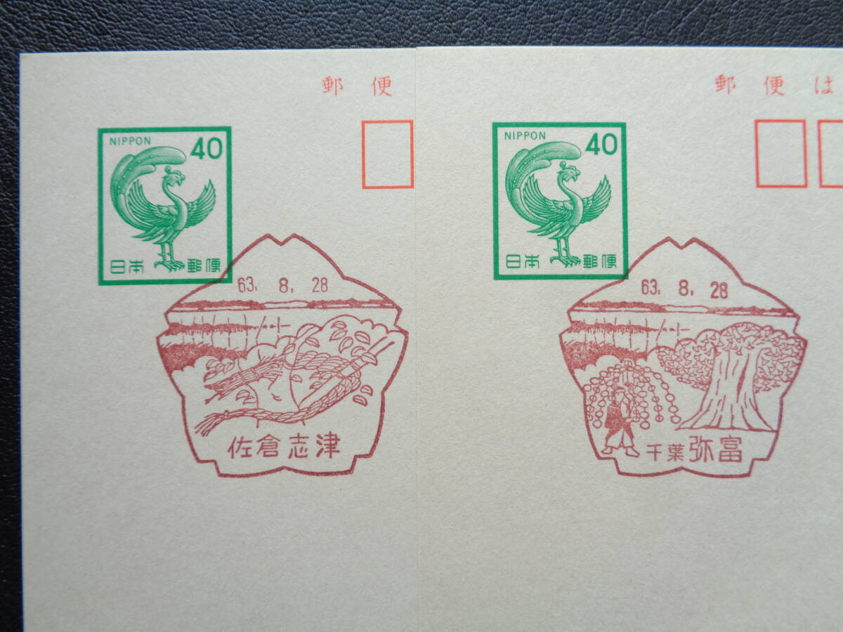 鳳凰はがき    初日印/風景印    千葉県2枚    佐倉志津/S63.8.28   弥富/S63.8.28