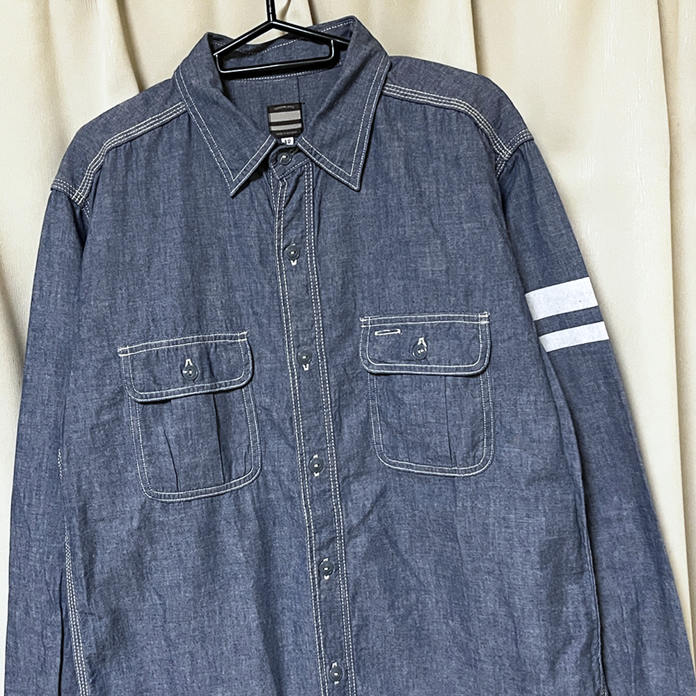 日本製、綿100%のブルーシャンブレー地、サイズは42です。