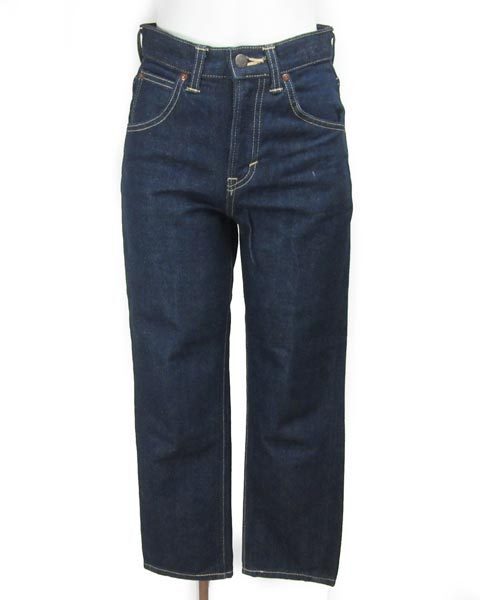 LEEとフォードミルズのコラボデニムです。カジュアルからキレイ目まで幅広いスタイルに着用頂けます。濃い目カラーでクールにみえます。牛革パッチがカッコイイですよ。ボタンにブランドアピールがあります。 |