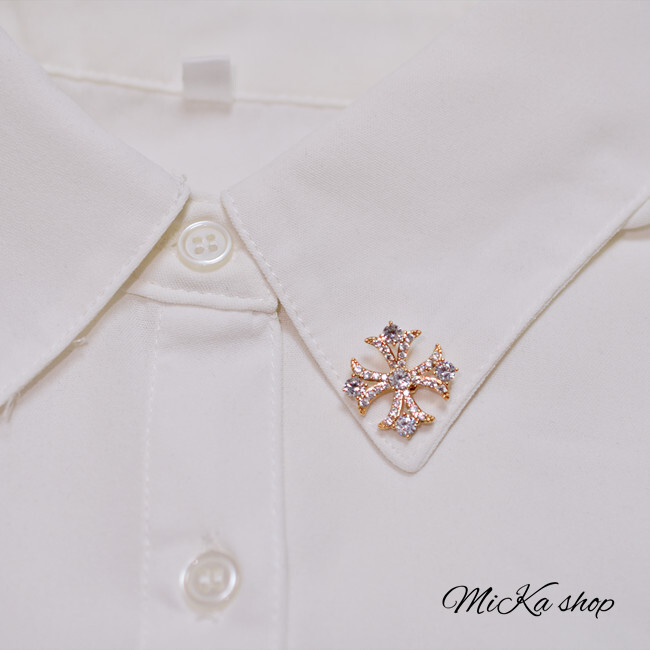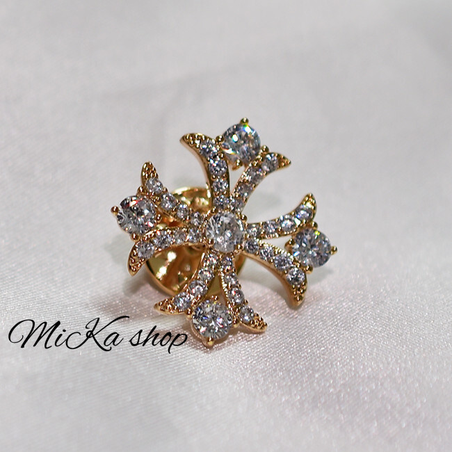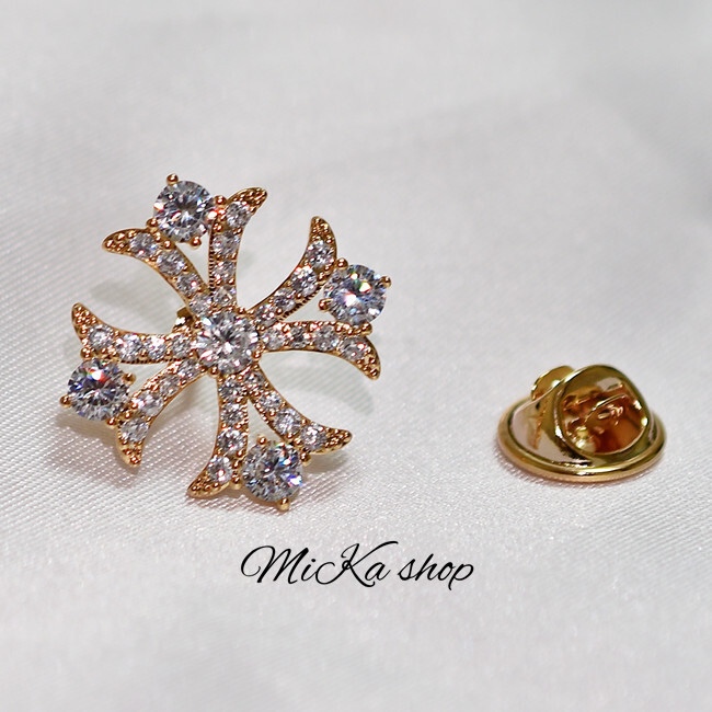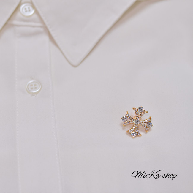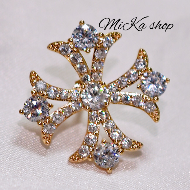~ジルコニアブローチ 十字架 ゴールド~●いろんなシーンで使える、付け外しやすいブローチです●シャツ、帽子、スカーフ、ストールなどに●サイズ:2.3x2.3cm●色:ゴールド●材質:ジルコニア、銅
