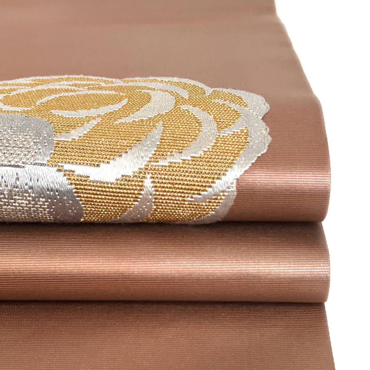 まるで皮のような上質なブラウンベージュの地に、銀糸などを用いて菊が刺繍された九寸開き名古屋帯です。どうぞこの機会に是非ともご検討下さい!