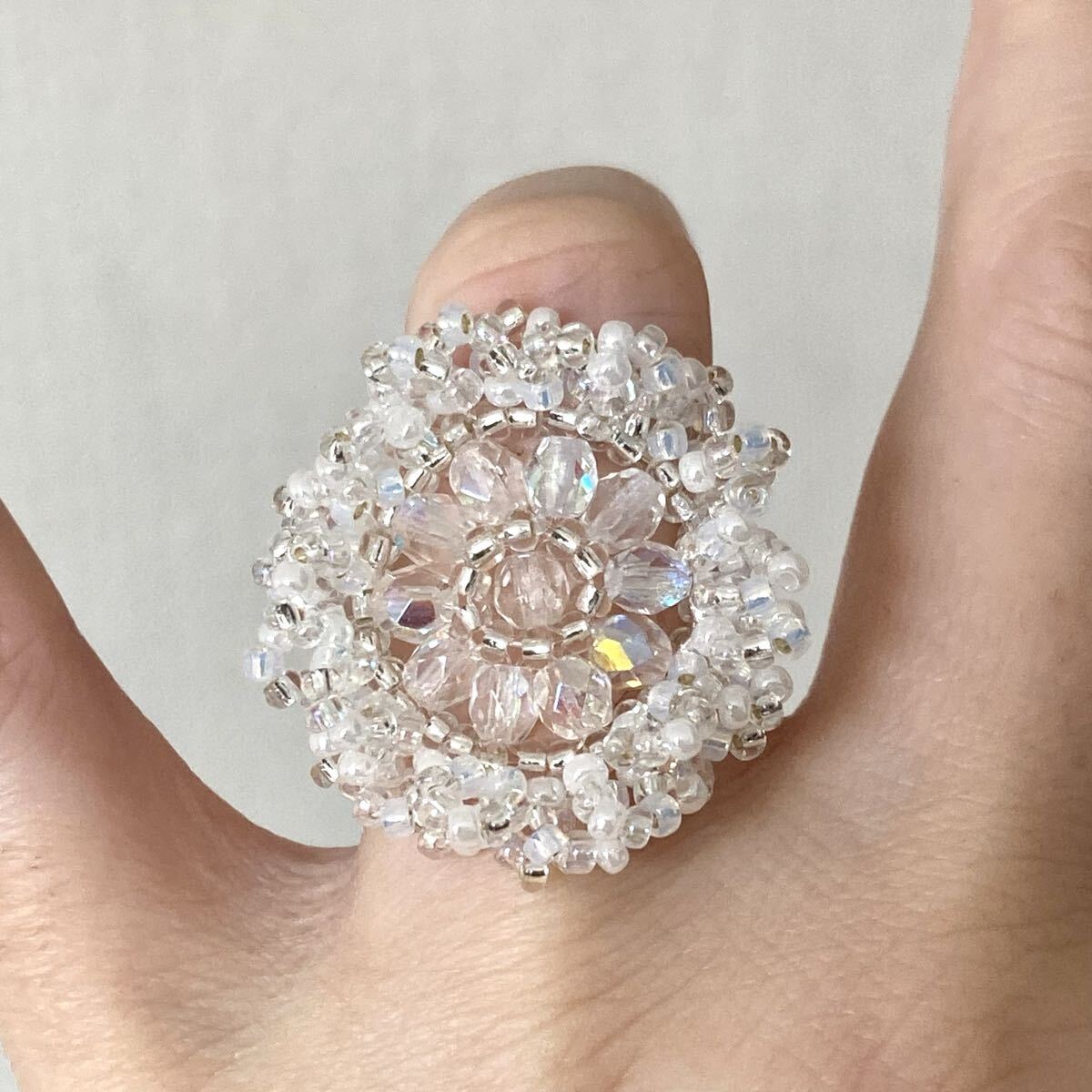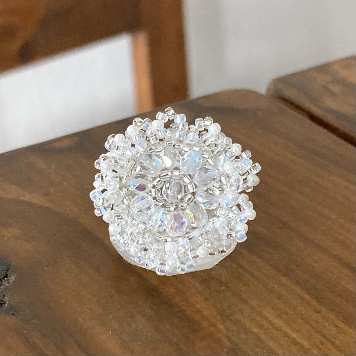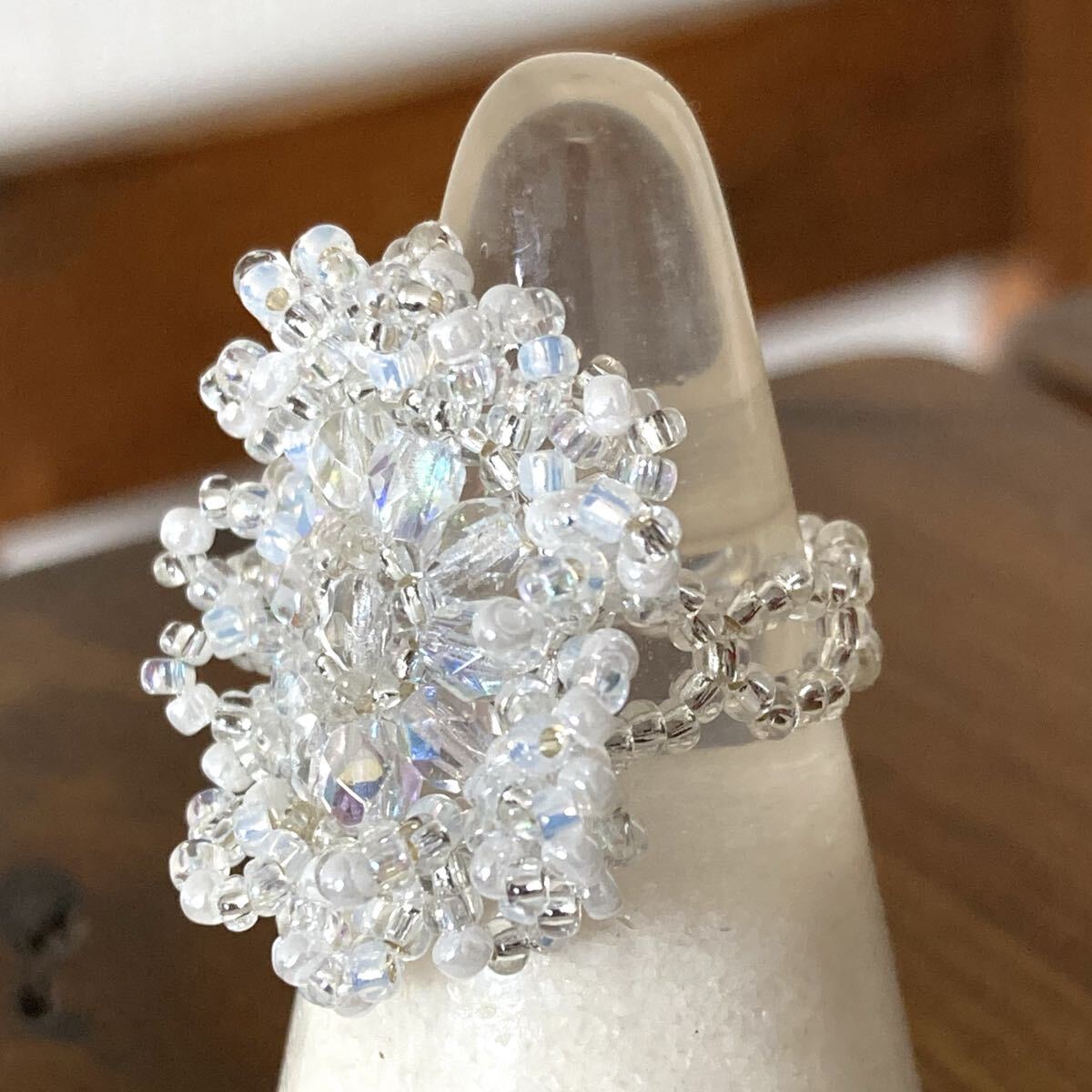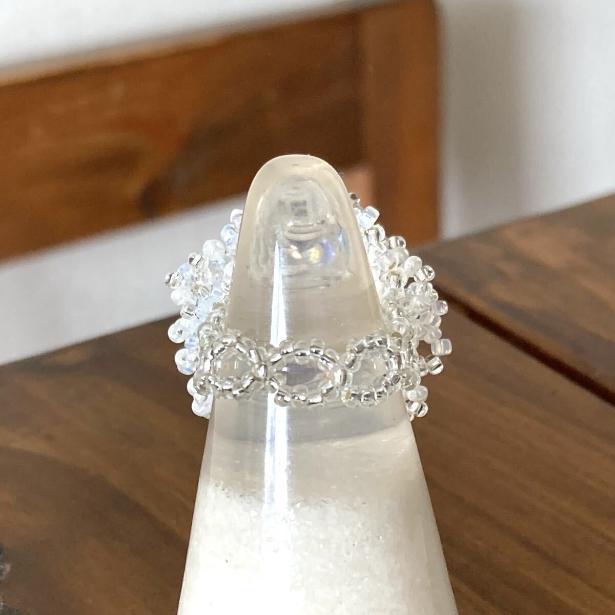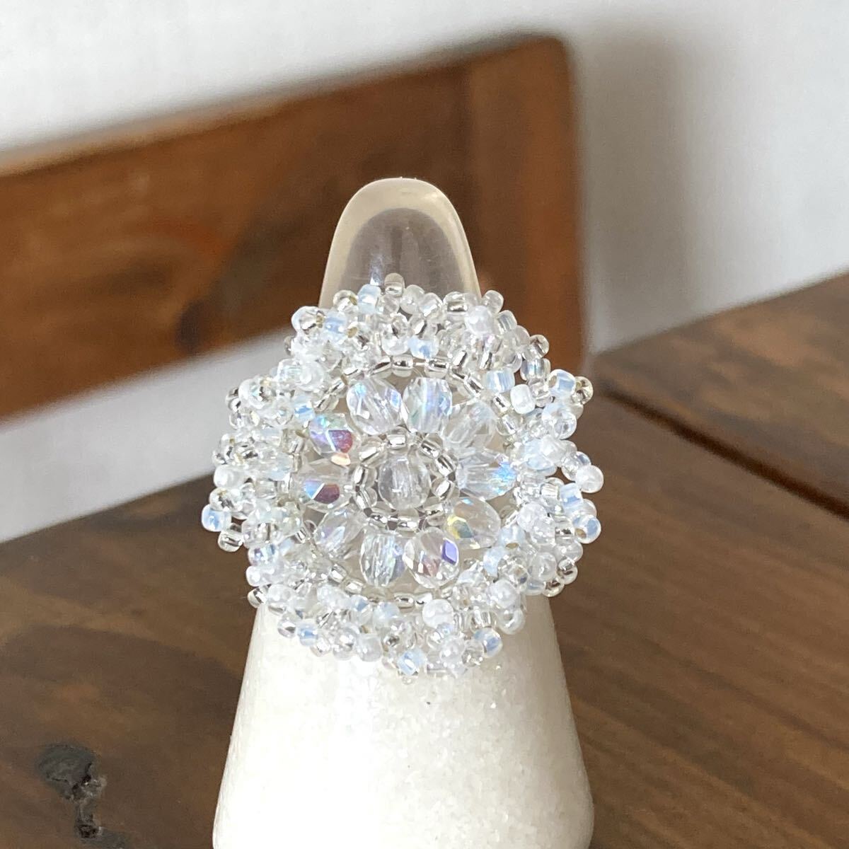 ビーズ リング 指輪 ハンドメイド 大きい丸型のレース風リング クリアオーロラ×白クリアミックス 15-17号です。