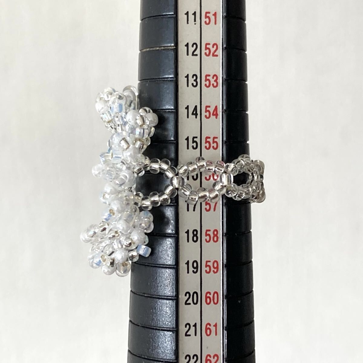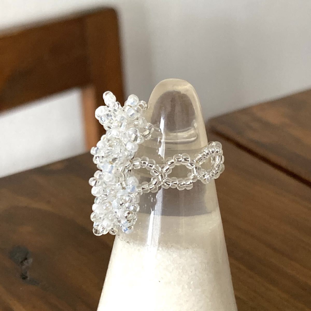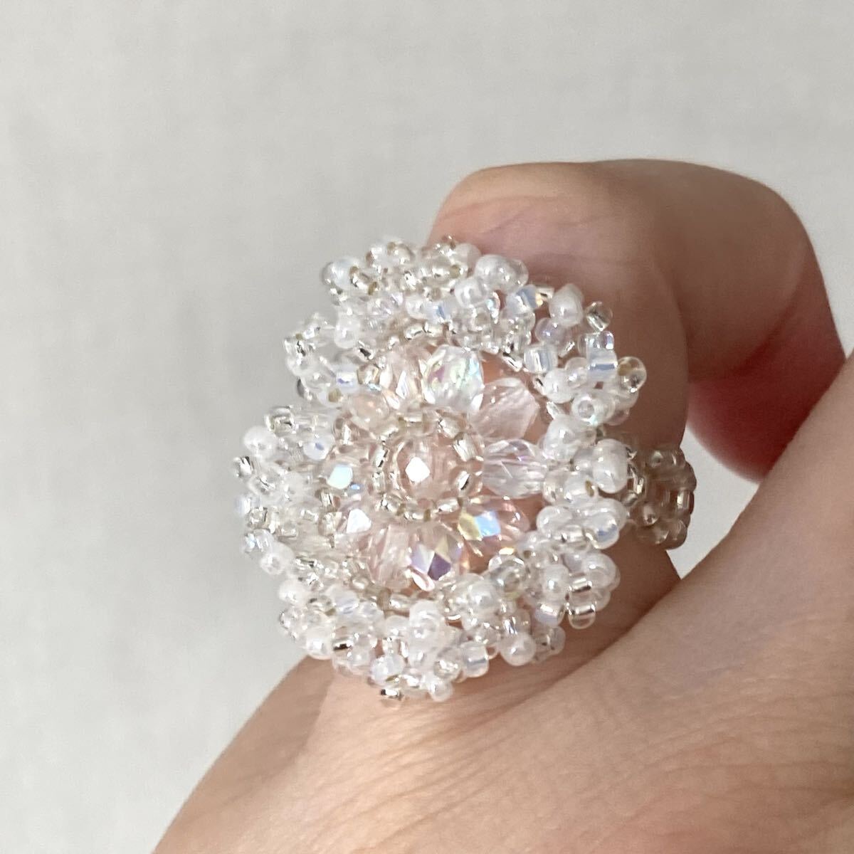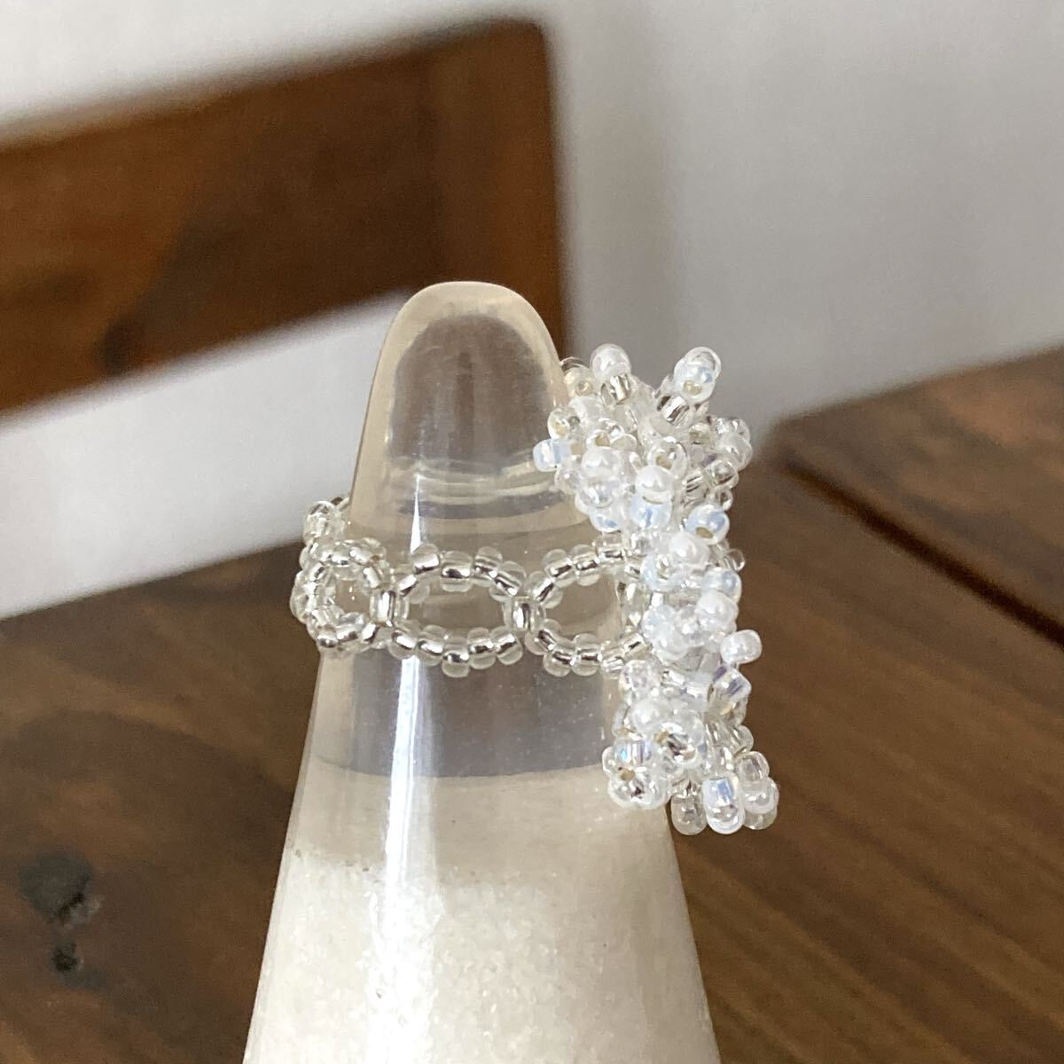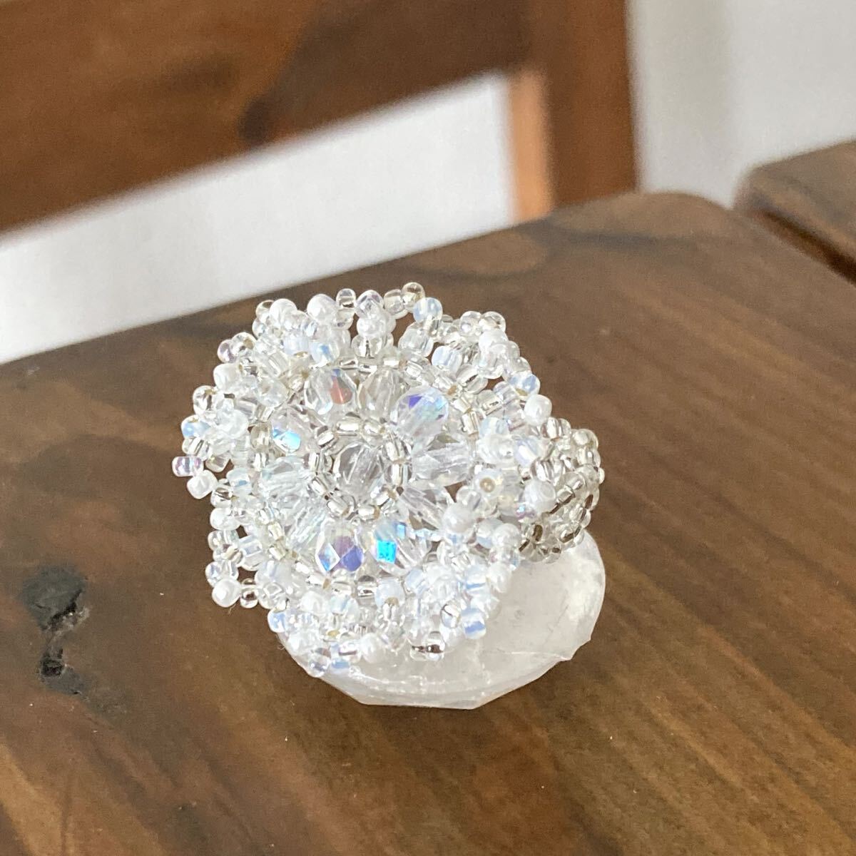ビーズ リング 指輪 ハンドメイド 大きい丸型のレース風リング クリアオーロラ×白クリアミックス 15-17号です。