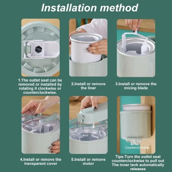 【簡単な操作】:材料を混ぜ、材料を準備し、ボウルに入れてよく混ぜます。ソフトクリームメーカーの電源を入れたら、混ぜた材料を内容器に注ぎます。約10分間かき混ぜ、スイッチを入れてアイスクリームを転がします。