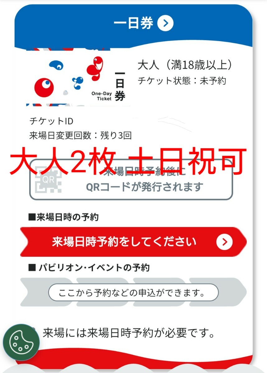 すでに万博IDを保有されている方のみご購入をお願い致します。 ご購入後、チケット受け渡し用URLを取引ナビでお送りいたしますので6時間以内にお受け取りください。