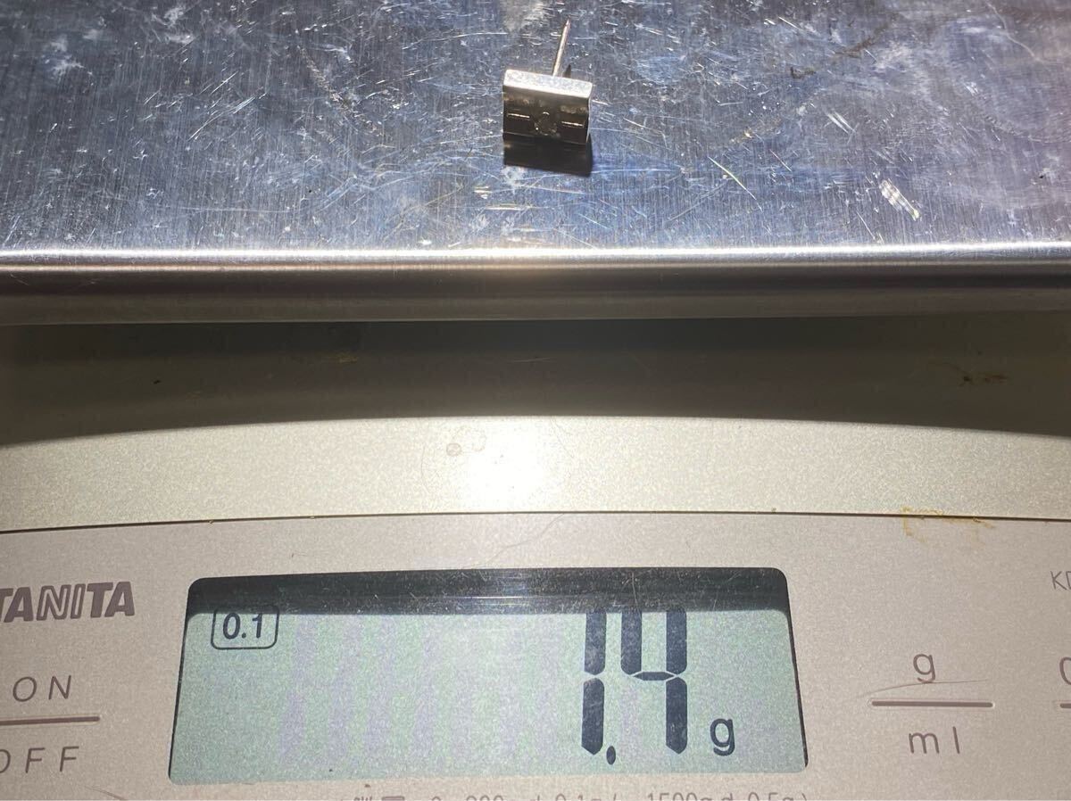 メレダイヤをあしらった14金ホワイトゴールドのタイピンです。大きさは縦約10ミリ横約8.2ミリ。重さは(キャッチは含みません)家庭用秤で約1.4グラム。台裏に『K14WG』の刻印がなされています。ケースに経年の変色が見受けられます。