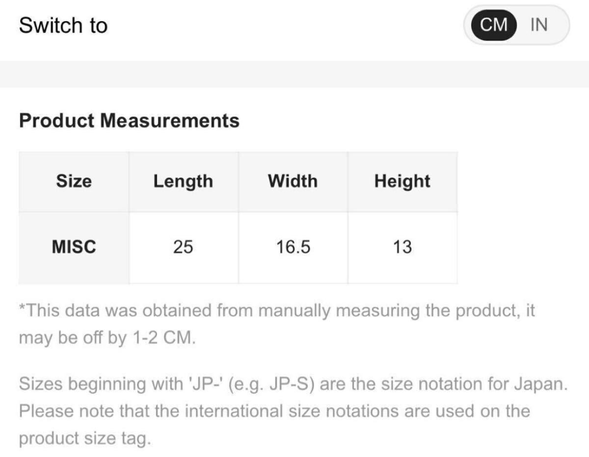 ※このデータは手動で製品を計測したものであり、1〜2CMの誤差が生じる 場合があります。