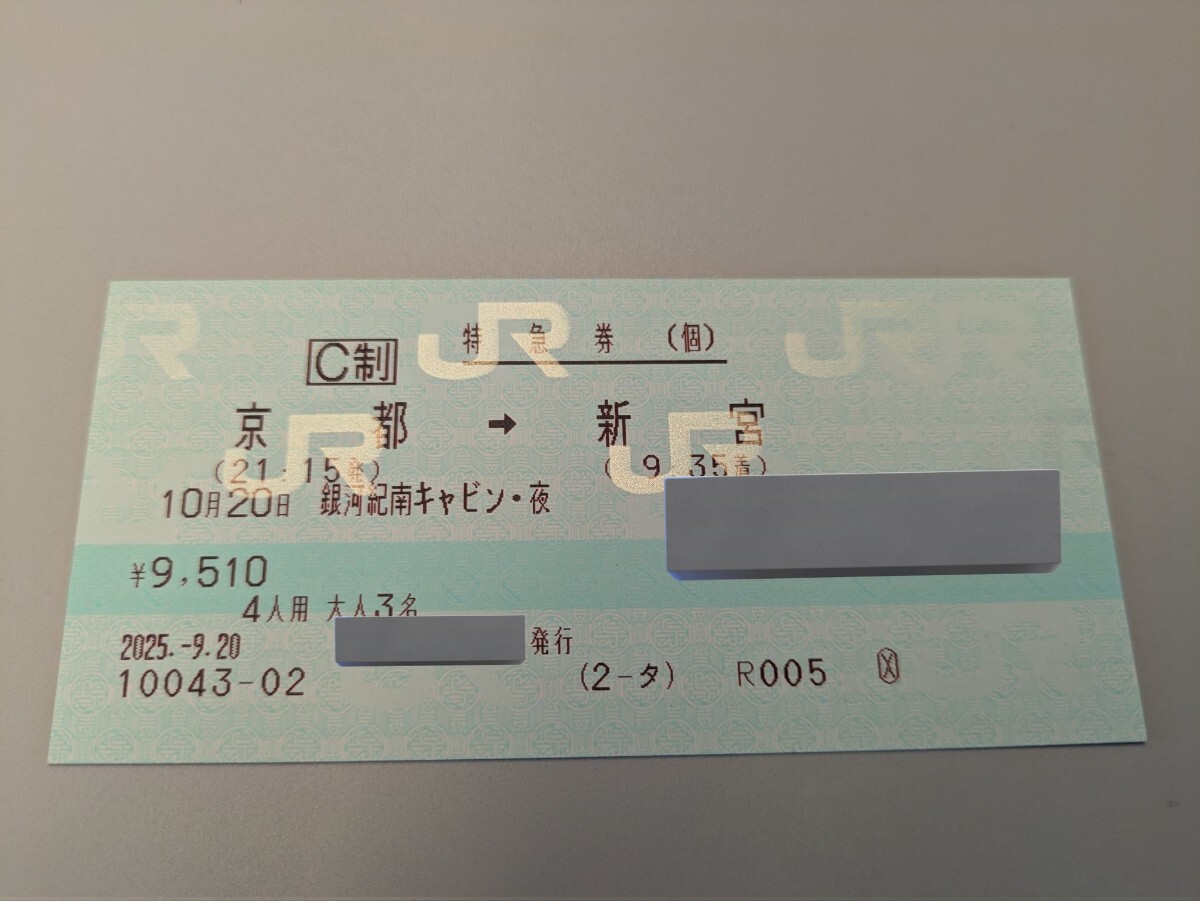 10/20 WE銀河 京都→新宮 キャビン席(大人3人)です。