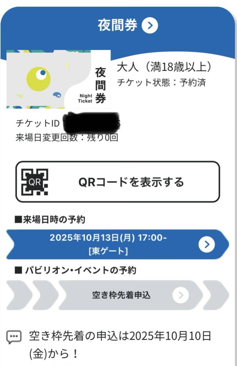 10/13東ゲート17時予約済み (16時から入場可能です)
