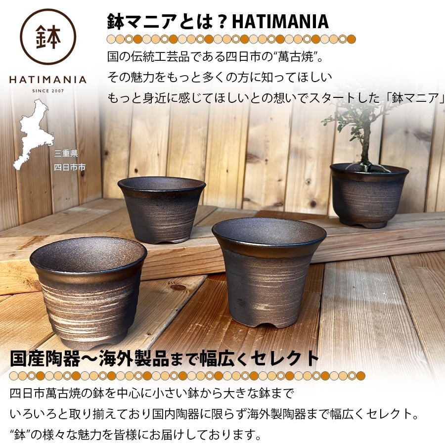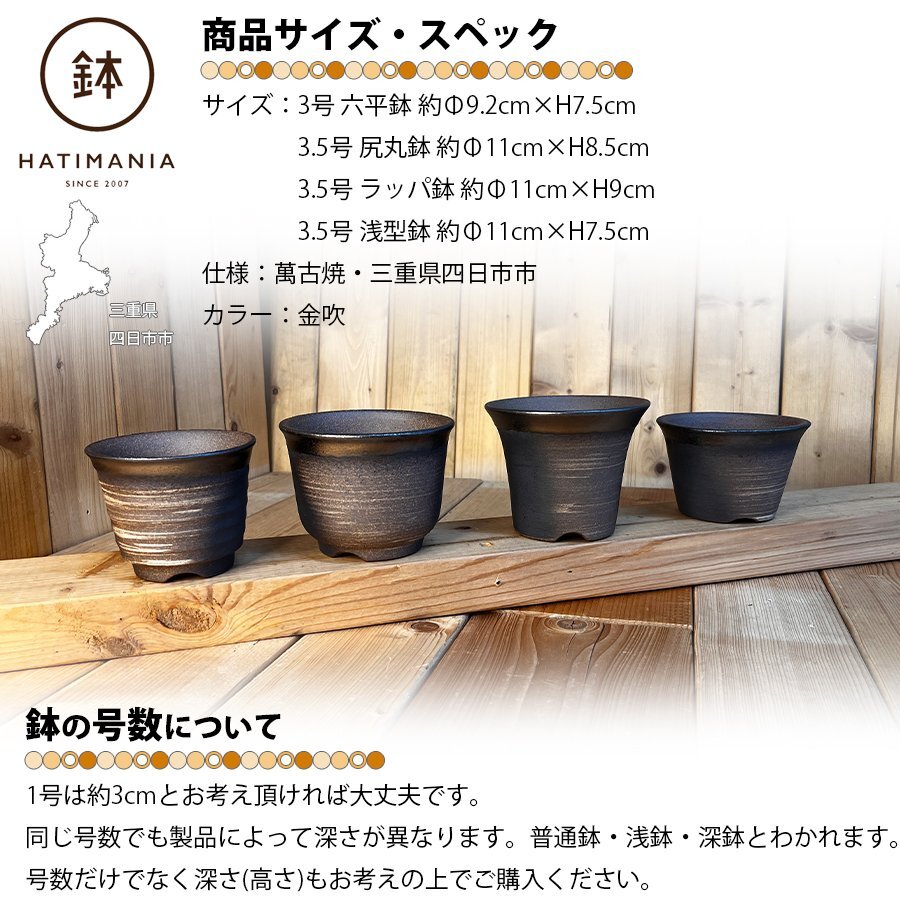 | 商品名:HATIMANIA 鉢マニア 金吹 盆栽鉢 サイズ:3号 六平鉢・約Φ9.2cm×H7.5cm サイズ:3号 尻丸鉢・約Φ11cm×H8.5cm サイズ:3号 ラッパ鉢・約Φ11cm×H9cm サイズ:3号 浅型鉢・約Φ11cm×H7.5cm 生産国:三重県四日市市・萬古焼 カラー:金吹  |