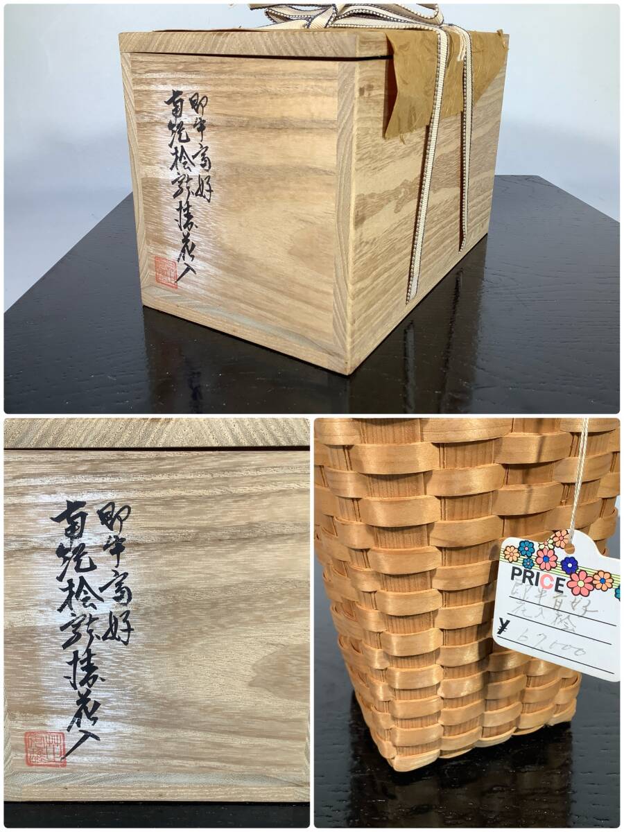 | 商品説明 | ごらんのような籠の花入れです。 未使用品と思います。 目立った痛みはございません。 共箱、共布、しおり付きです。 よろしくお願いいたします。 胴径 10cm 高さ 20cm | |