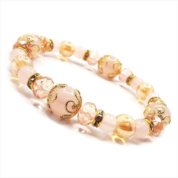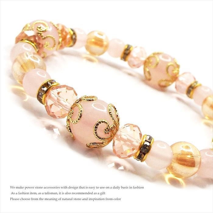 【STONE KITCHEN 天然石 パワーストーン】 ☆試練や辛さを幸せな実りへと変えてくれる愛情ブレスレット☆ ローズクォーツは恋愛や人と人との関わりすべてに 愛と調和のエネルギーをもたらすパワーストーン。 辛い恋・ギクシャクした関係もゴールデンオーラが あなたの曇った心に陽の光を差し込み、願いを叶える力を与えてくれます。 内周:約16cm サイズ:ローズクォーツ 約10mm・約6mm ゴールデンオーラ 約8mm 1点 注意事項 ※金属部分は汗や汚れ等で変色する場合がございます。気になる場合は 金属磨きや布等で軽くふき取る事をおすすめします。 ※石の種類によっては、艶を引き出すことを目的として、ワックスや着色加工がされているものもあります。 ※表示のサイズは必ずしも最大値・最小値のサイズのものが入っているわけではございません。 ※天然石のため同じものでも色味・模様などが異なります。 ※照明の具合で実際とは色合いが異なる場合がございます。 また、天然素材特有のクラック・内包物を有する場合がございます。予めご了承下さい。 | |