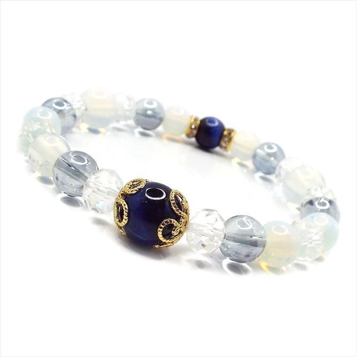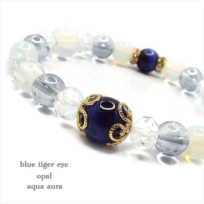 【STONE KITCHEN 天然石 パワーストーン】 柔らかなブルーで持ち主の気持ちを 穏やかにして愛情豊かにする石の組み合わせです♪ 優しく爽やかなブルーの共演。 見つめているだけで心が癒やされる デザイン・配色のブレスレットに仕上がりました!!! 全体的に癒やしの効果がとても強いですがふわふわした癒やしではなく 心の奥が研ぎ澄まされるようなそんな集中力を得ることができる そんな想いを込めたブレスレットです☆ 内周:約16cm サイズ:ブルータイガーアイ 約10mm・約8mm アクアオーラ 約8mm シンセティックオパール 約10mm・約8mm 1点 注意事項 ※金属部分は汗や汚れ等で変色する場合がございます。気になる場合は 金属磨きや布等で軽くふき取る事をおすすめします。 ※石の種類によっては、艶を引き出すことを目的として、ワックスや着色加工がされているものもあります。 ※表示のサイズは必ずしも最大値・最小値のサイズのものが入っているわけではございません。 ※天然石のため同じものでも色味・模様などが異なります。 ※照明の具合で実際とは色合いが異なる場合がございます。 また、天然素材特有のクラック・内包物を有する場合がございます。予めご了承下さい。 | |