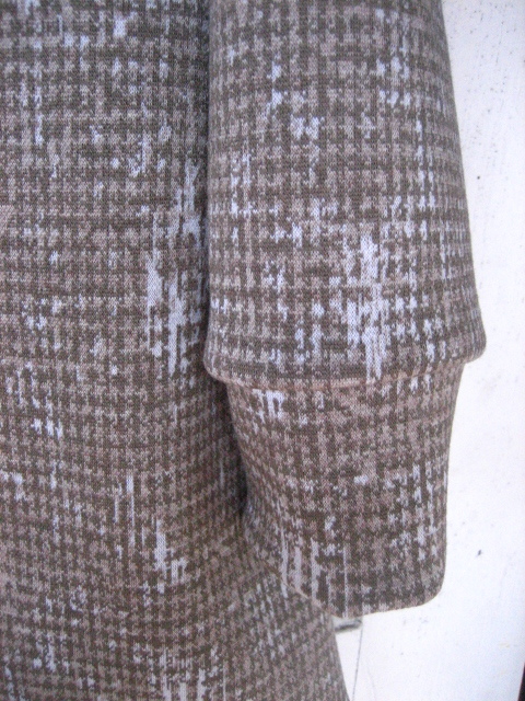 ウール15%ポリエステル85%のジャガードニット、カーキ茶濃淡×オフの細かな千鳥模様です。