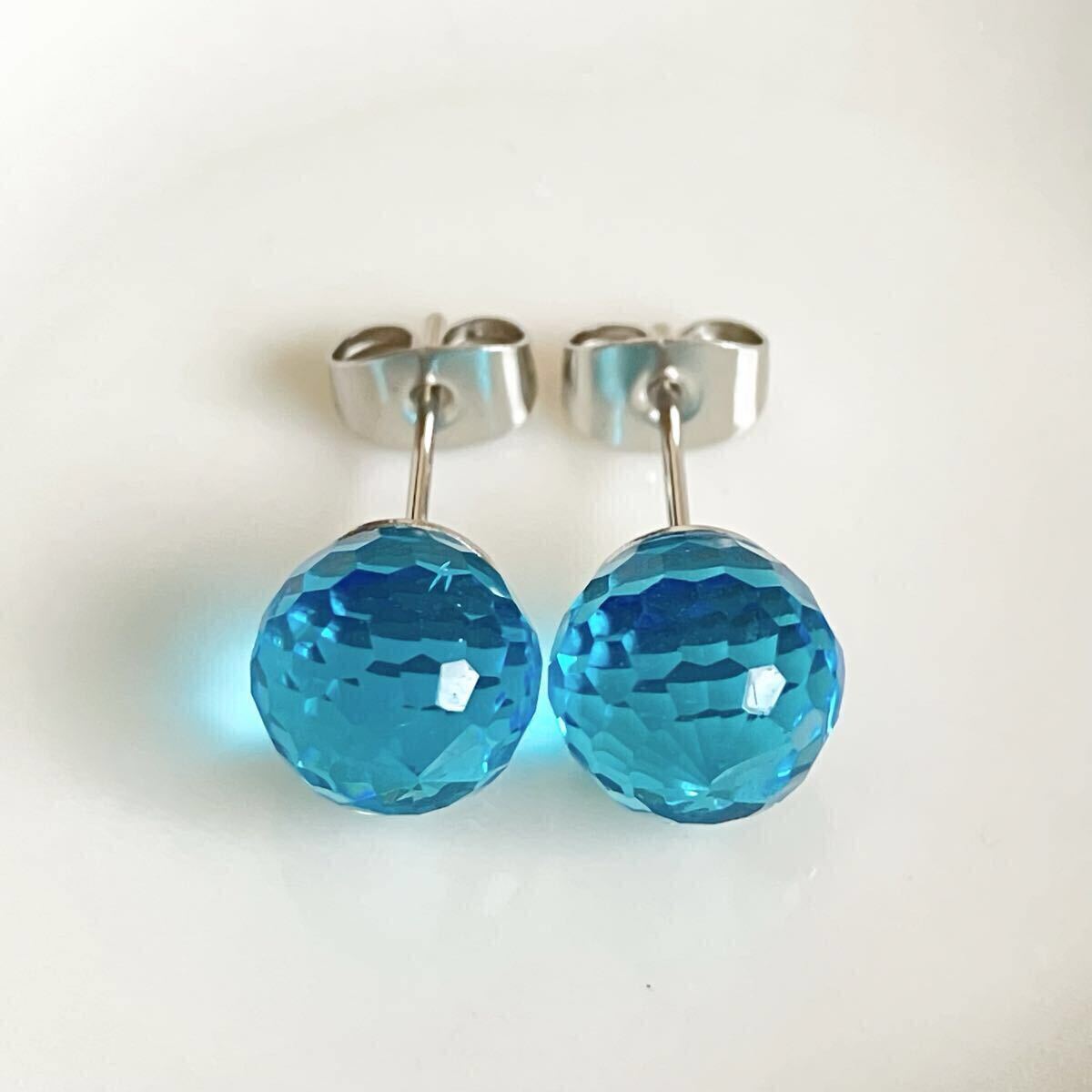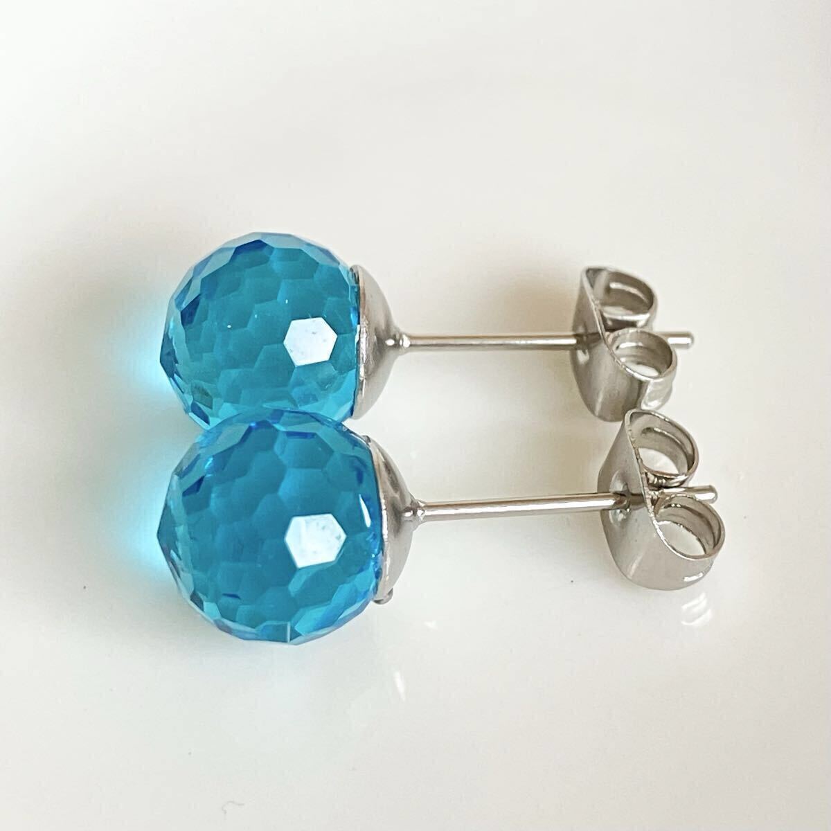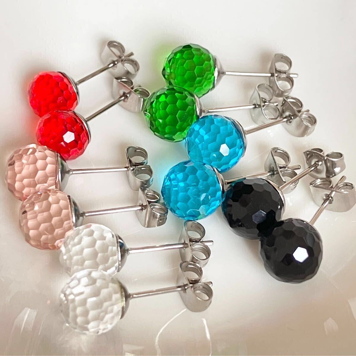 繊細なカットが入ったガラスクリスタルボールのピアスです。光を受けてきらりと輝いて綺麗です。お肌に優しいステンレス製のお品です。