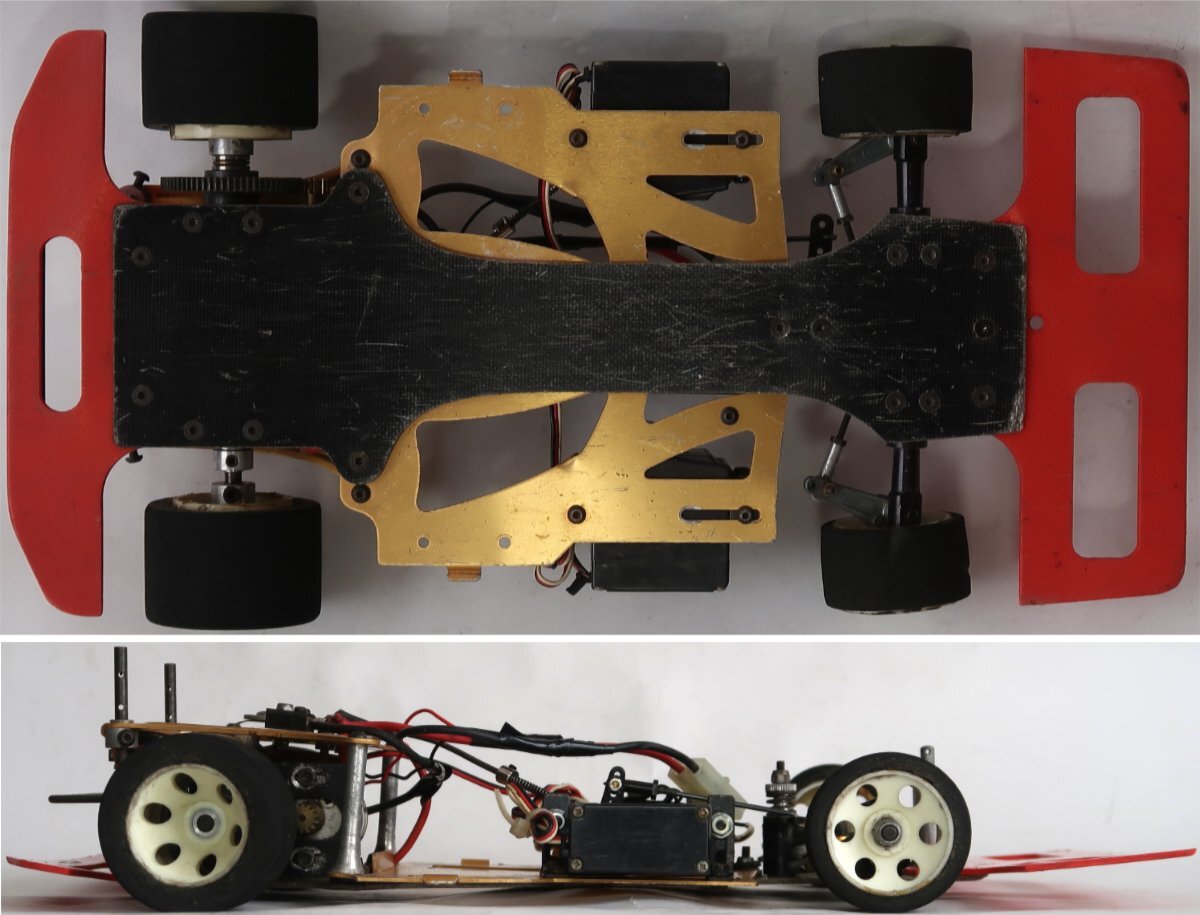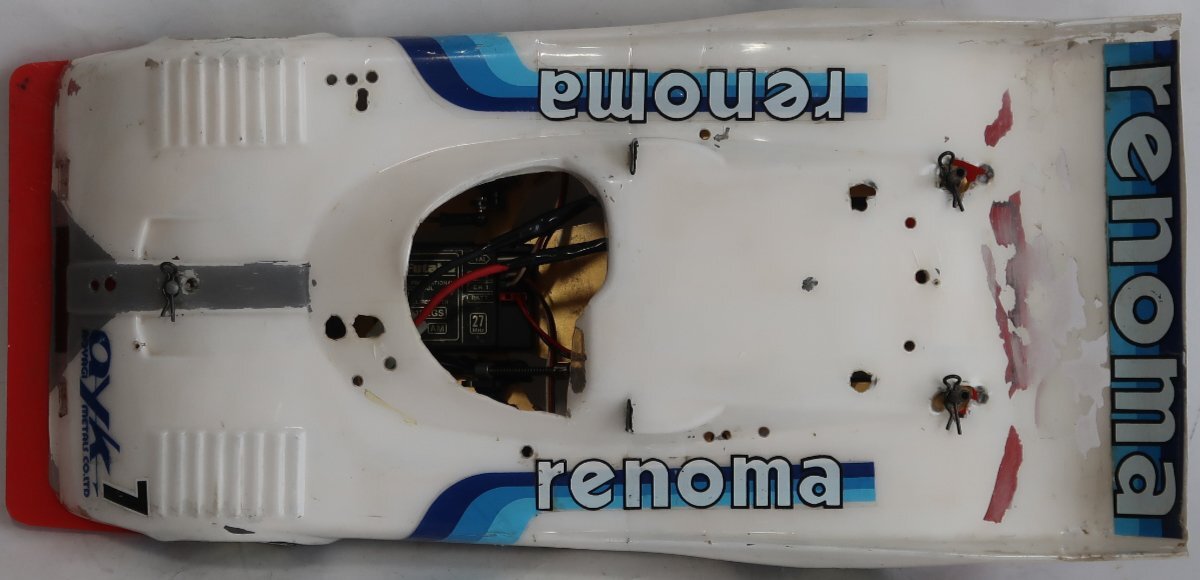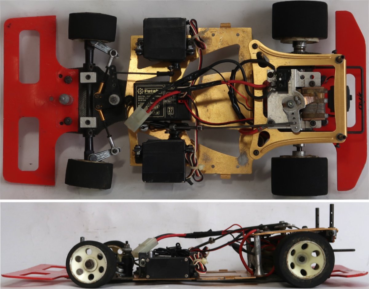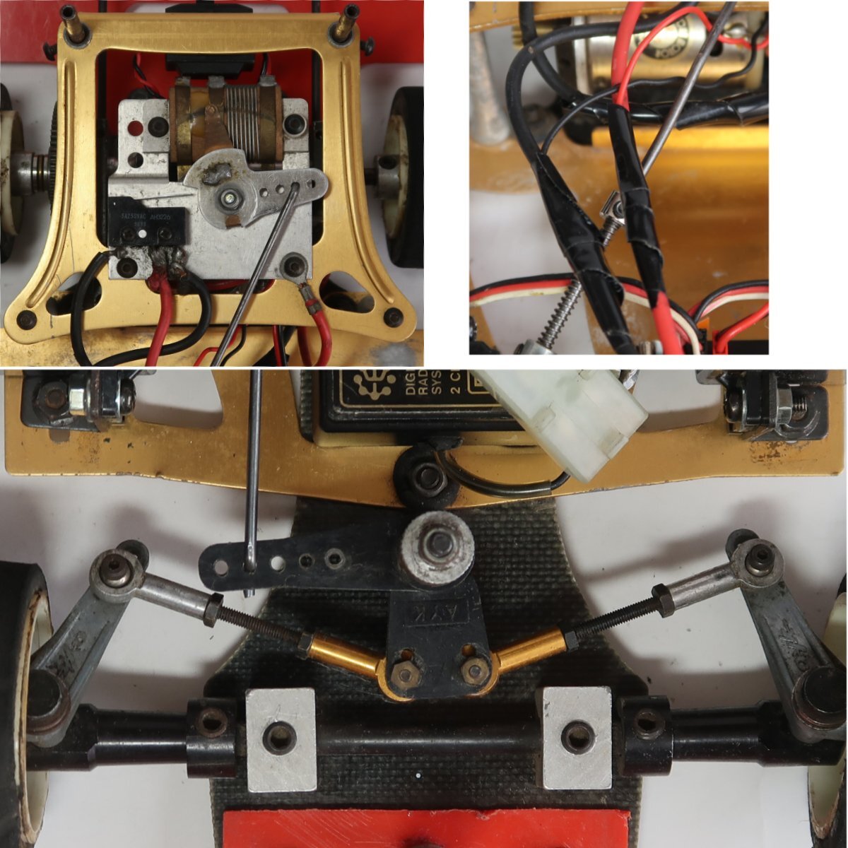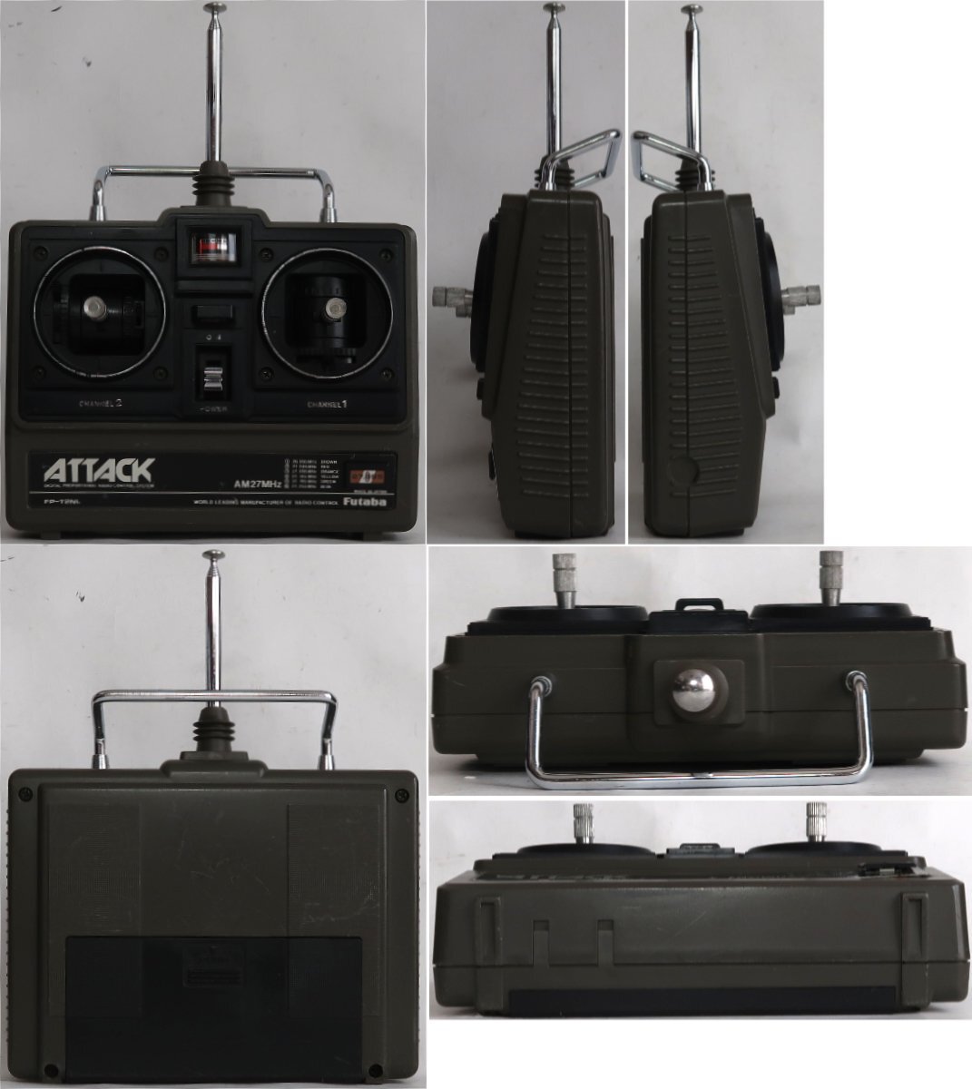 出品は画像の物のみです。他に必要なものがあればご自分でご用意ください。使用品ですので擦り傷や汚れがあります。ボディは傷や汚れありますし、穴が多数空いています。ある程度はクリーニングしました。床に置いて押せば駆動系は動作しています。プロポに電池を入れてバッテリーを繋げてテストしました。動作はしております。プロポの操作もできました。スピードコントローラーはサーボとのリンケージがないので操作ができません。手動でスピードコントローラーのロッドを操作すればモーターは前進と行進の回転します。デフも動作しております。アンテナホースの留め具のネジがないです。またバッテリーのゴムバンドはありません。受信機のバッテリー用のケーブルはバッテリーケーブルに繋いているのですが、はんだ付けせずに巻いているだけなので半田付けしたほうがいいです。あとは画像をご覧になってご判断ください。分かる事は以上です。お取引後は一切のサポートはしておりませんので問題があればご自分でご対処ください。お取り引き後に説明以外の不足品や説明以外の破損や故障が有ったとしても返品は出来ませんしクレームもお受けできません。問題があれば全てご自分でご対処ください。