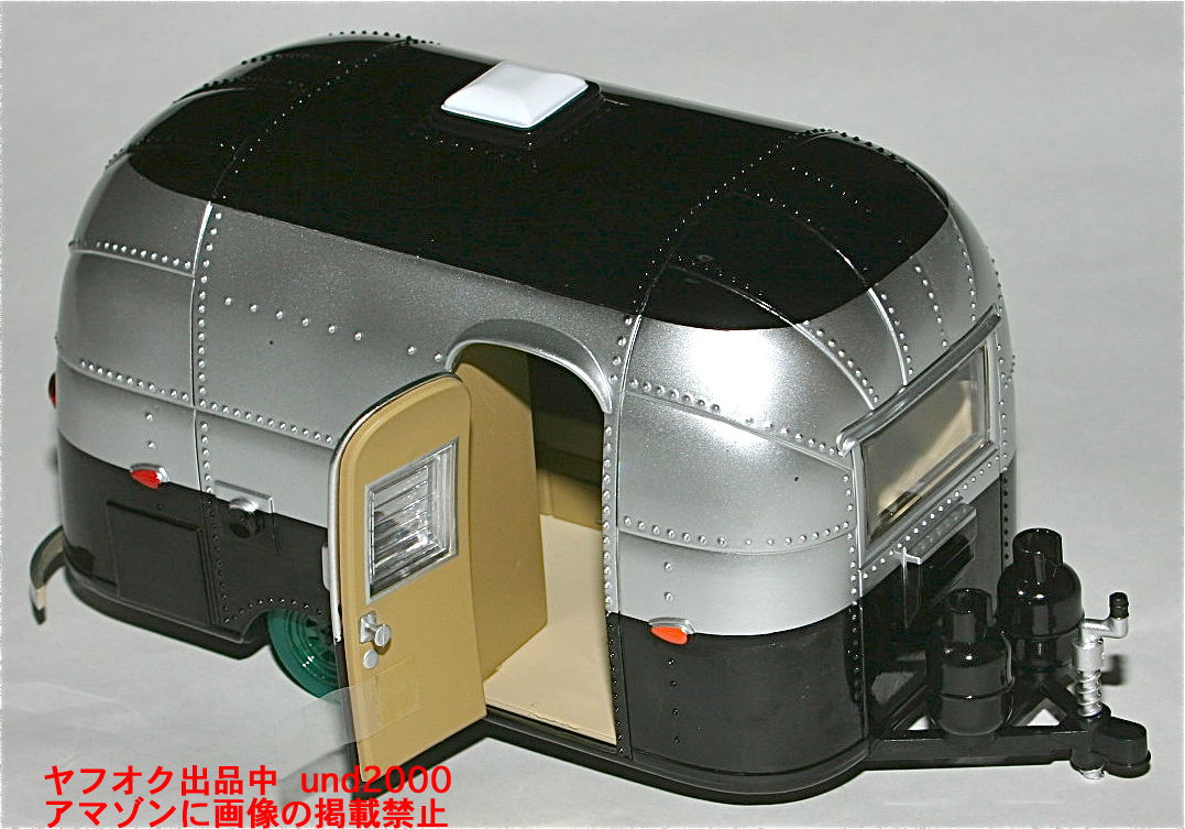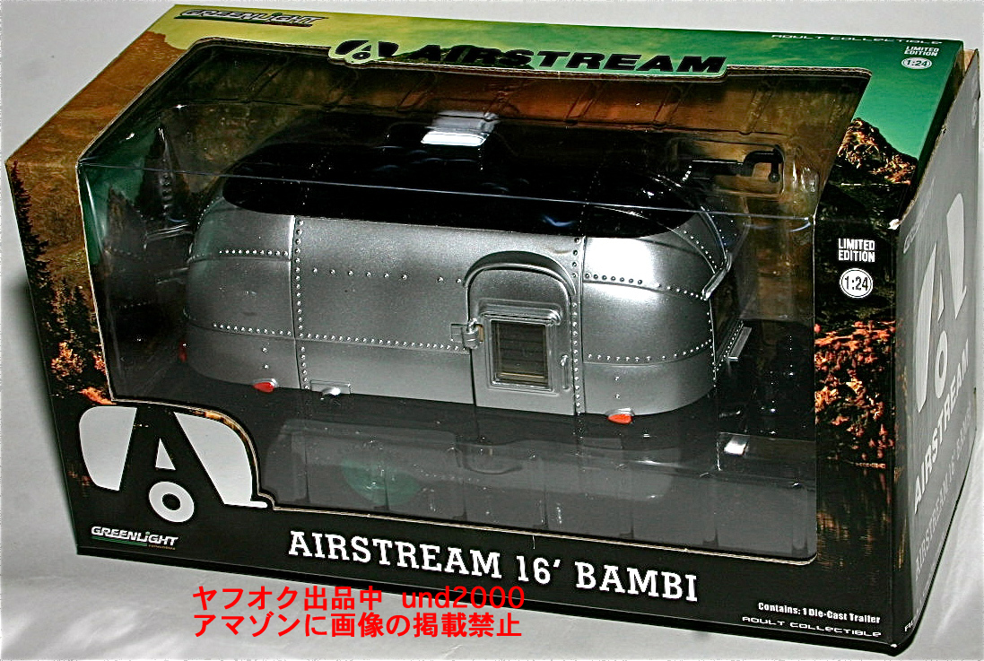 Green Light #18226、Airstream 16' Bambi。シルバー/ブラック。グリーンライト版トレジャー・ハント(チェイスカー)、ホイール、タイヤがグリーンのグリーンマシーン。スケール1/24。並行輸入品。未使用新品。箱に若干のスレがあります。量産品の製品のクオリティーについてはノークレームでお願いいたします。お支払いはヤフーかんたん決済のみ。東京発、ゆうパック持込60サイズ(東京700円 - 沖縄1330円)、または定形外郵便(追跡番号、保険無し)920円の発送となります。(上記の送料はこの出品物のみの料金となります。複数落札、同梱包発送の場合、重さ、サイズが変わりますので送料が変わります。)3日以内のご連絡、かんたん決済の支払期限内(通常5日、支払方法により異なります)のお支払い厳守でお願いします。入札される前に「自己紹介」もあわせてお読みください。 検索用ワード グリーン・ライト キャンピングカー キャンピングトレーラー トラベルトレーラー トレーラーハウス Green Machine Chase チェスカー チェース チェス チェイス チェイスカー