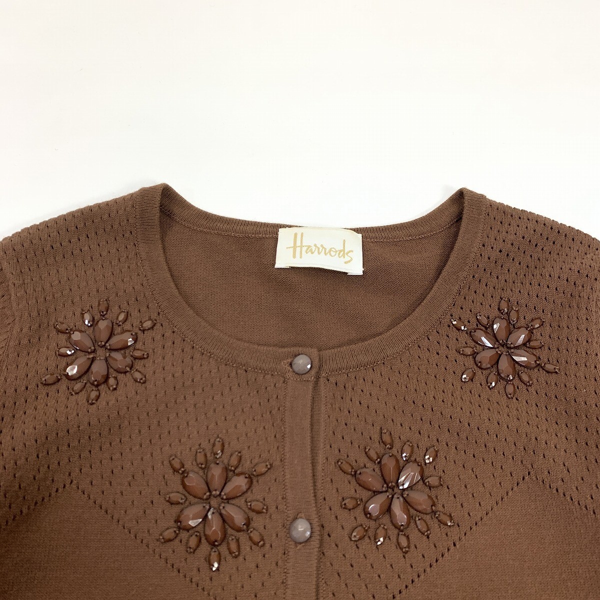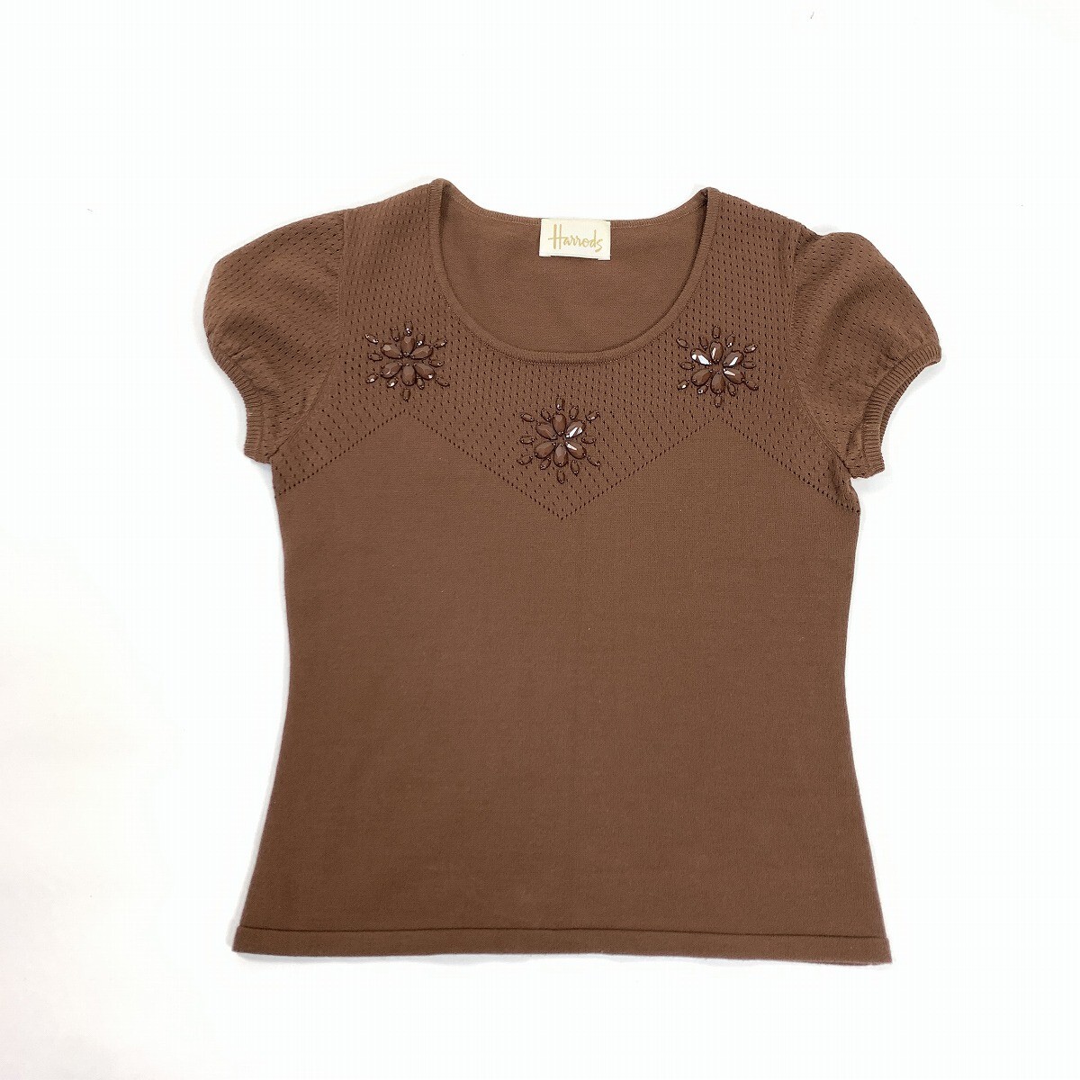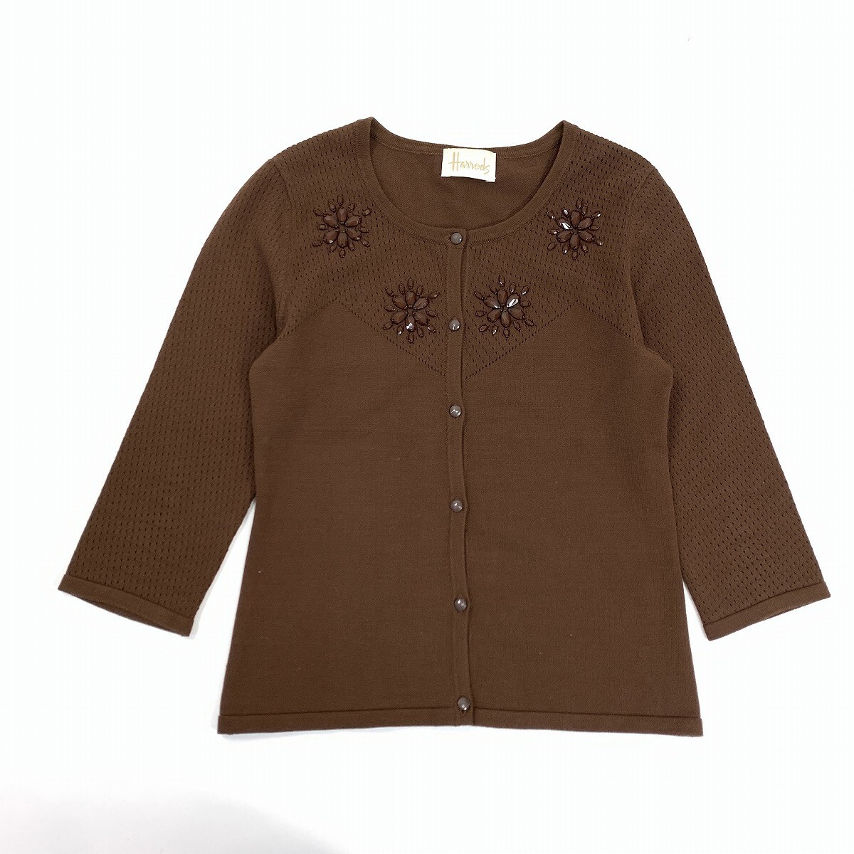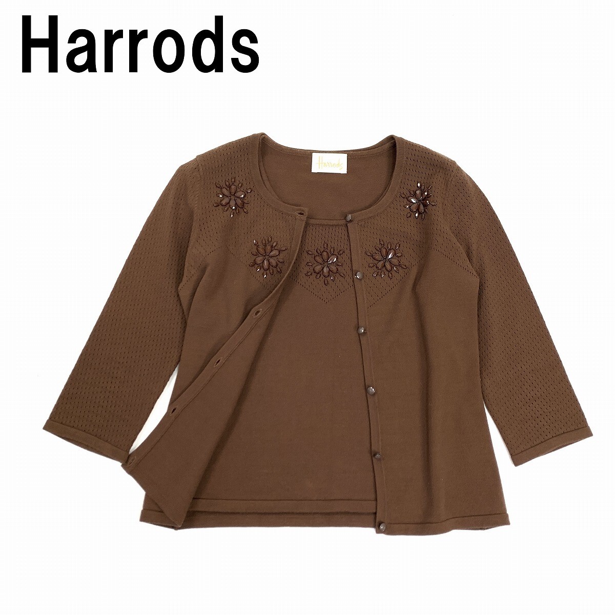 Harrods ハロッズ ニットアンサンブル レーヨン 半袖 七分袖カーディガン ビジュー 茶色 ブラウン M相当 YC1161