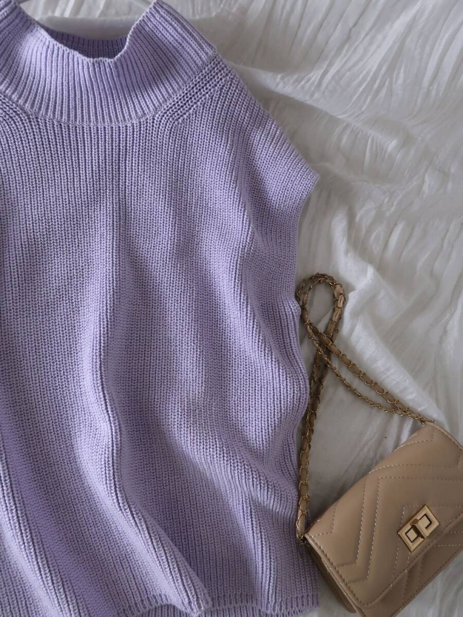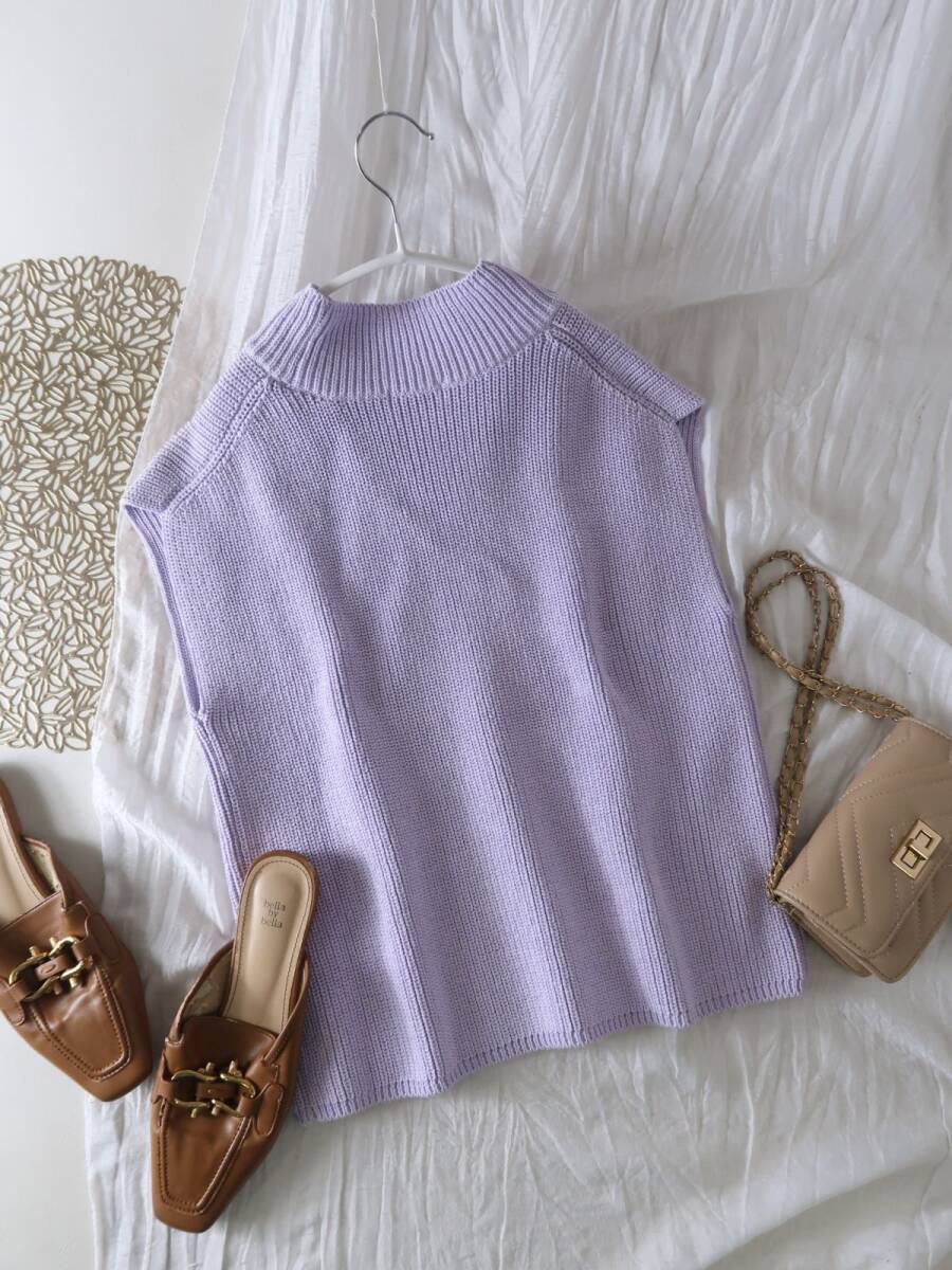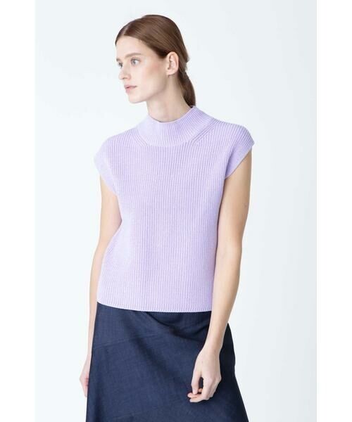 コットンの爽やかさとポリエステルのさらりと清涼感ある特徴を併せ持った編地で作られた、ノースリーブニットプルオーバーです。ざっくりとした編地がゆったりとしたリラックス感を漂わせます。低めのタートルネックで首元を締めてきちんと感もプラスしています。
