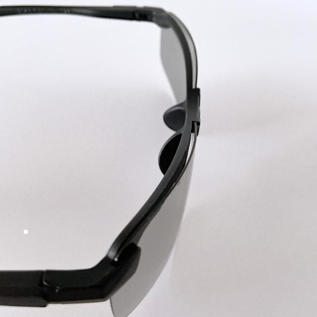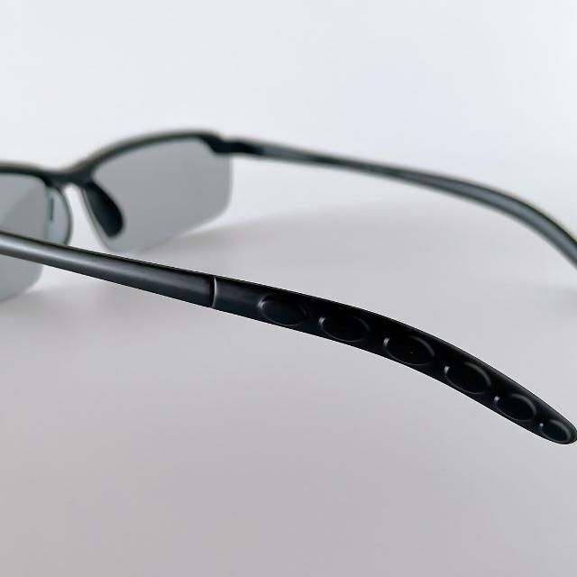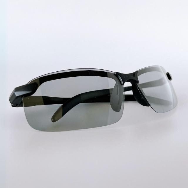 偏光レンズが反射光をカットし、調光レンズは紫外線に応じて色が変化。昼夜を通じてクリアな視界を確保。
