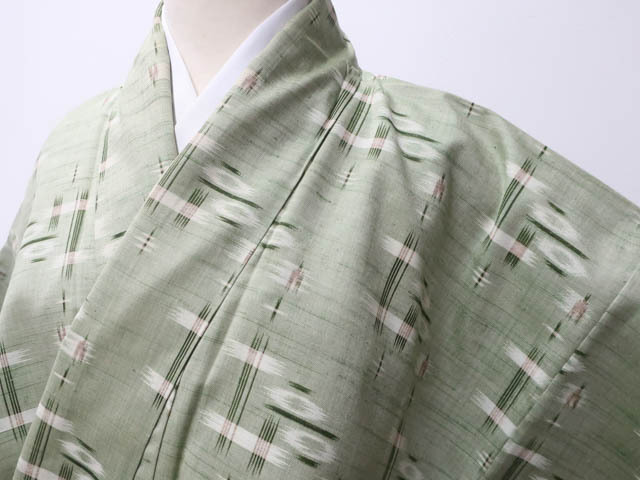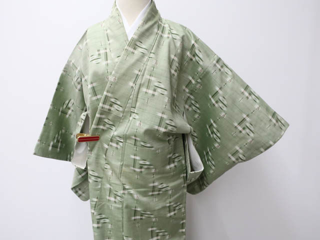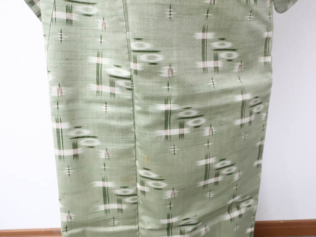 リサイクル商品のため、前身頃袖・八掛・衿裏など所々シミ、スナップボタン汚れがございますがご着用いただけると存じます。 地色は黄緑です。 1枚目の画像が近いお色かと思われます。 素材は正絹です。 |