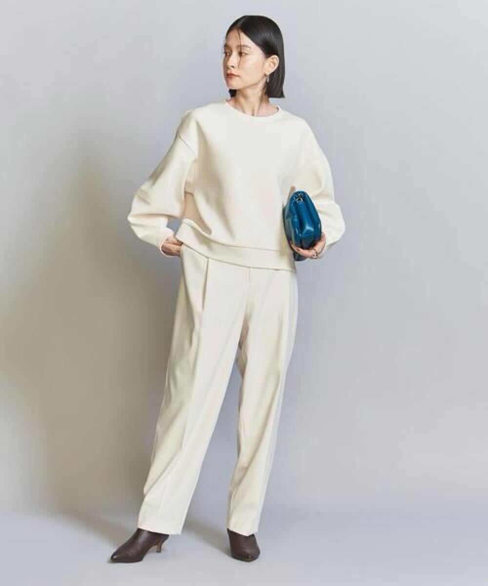 センタープレス入りのタックパンツ等、ややマニッシュな印象のきれいめボトムと合わせるのがおすすめ。