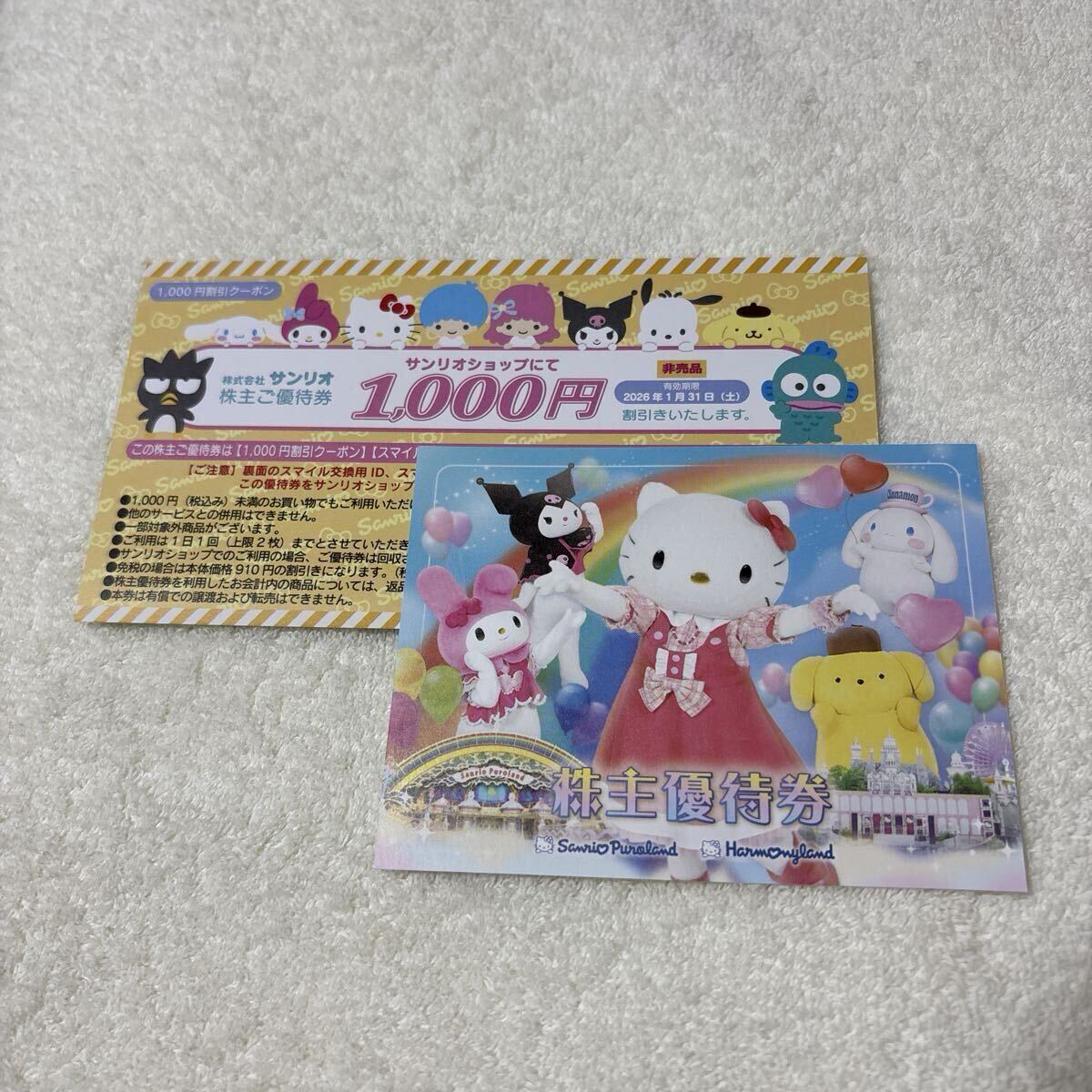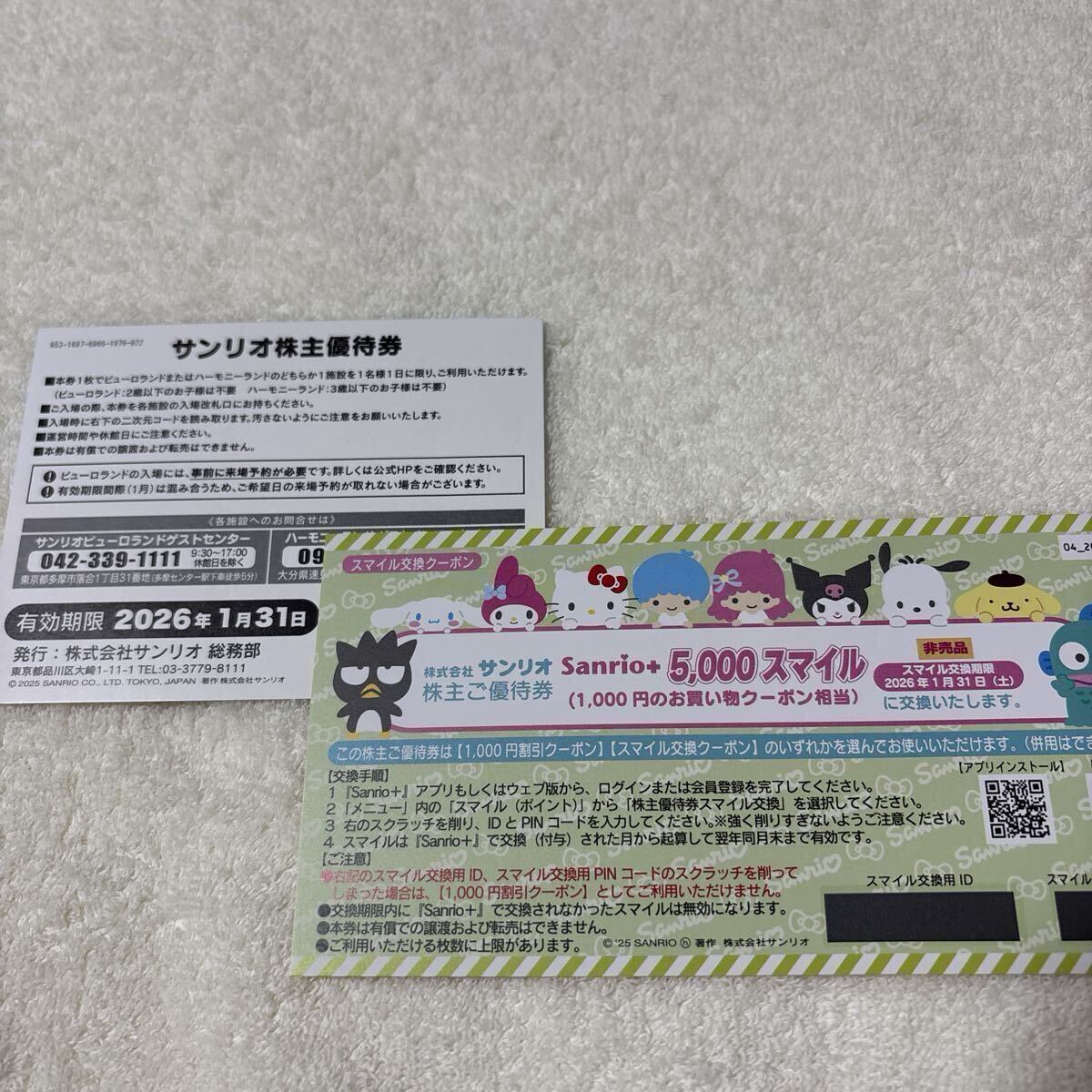 サンリオ株主優待券1枚+サンリオショップの1,000円割引または5,000スマイル交換券1枚