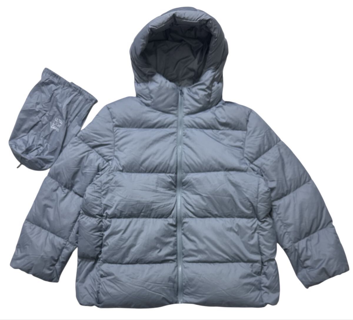 素材 【 表側、フード裏-ナイロン100%/中わた(本体)-ダウン90%フェザー10%/フード縁部分(外側)-ダウン90%フェザー10%/フード縁部分(内側)-ポリエステル100%/裏側-ナイロン92%複合繊維(ナイロン)8%】
