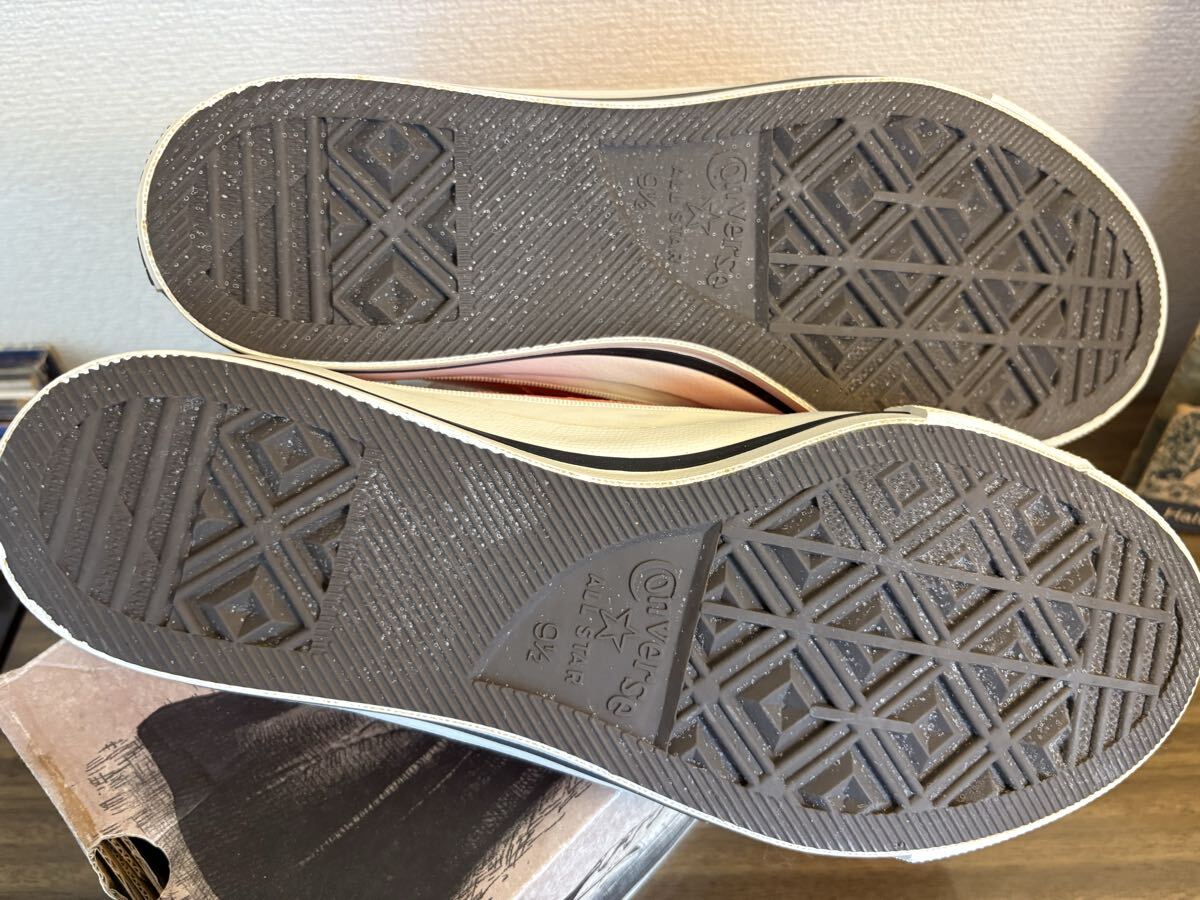 ソール裏に経年的な白い汚れのようなものが見受けられます。硬化はありません。