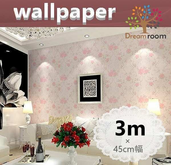 【 3m 】 3D 壁紙 45cm幅 薔薇 花柄 ピンク×白 アンティーク ウォールペーパー北欧風 インテリア 糊付き はがせる シール DIY 賃貸