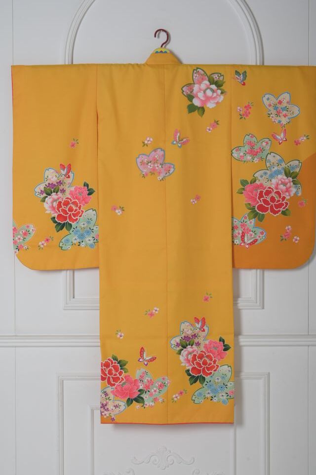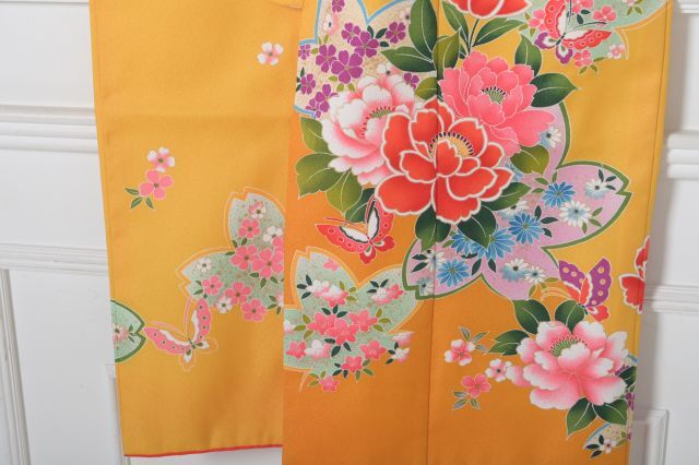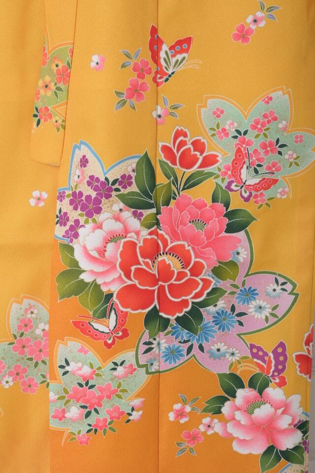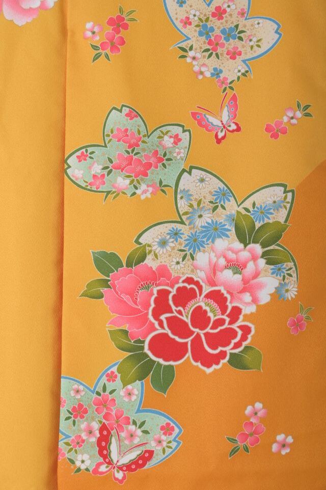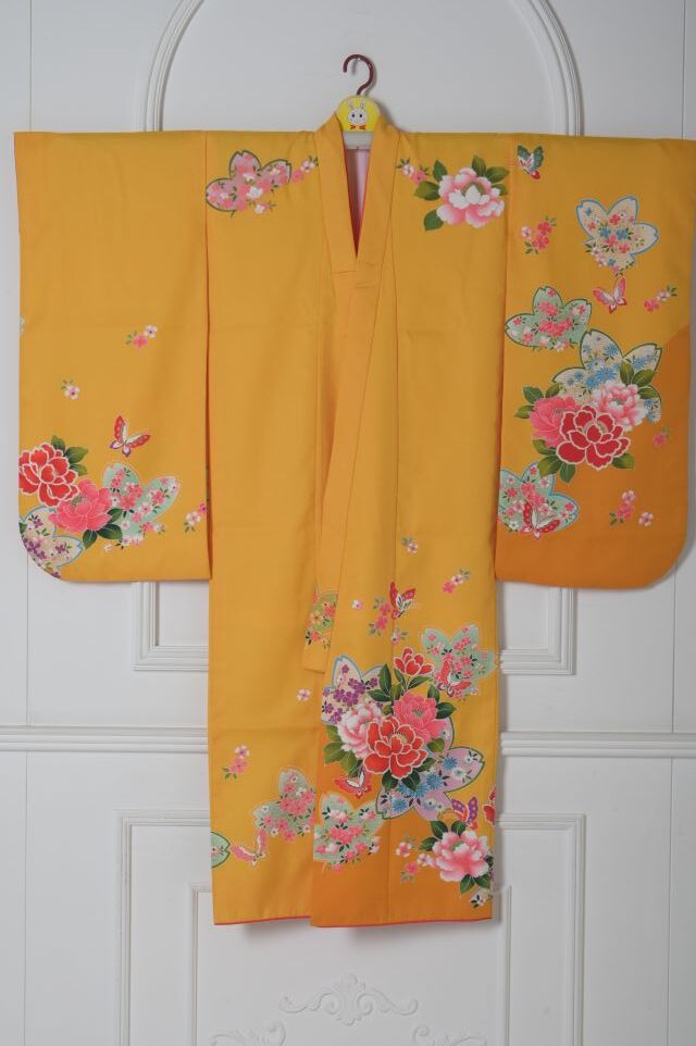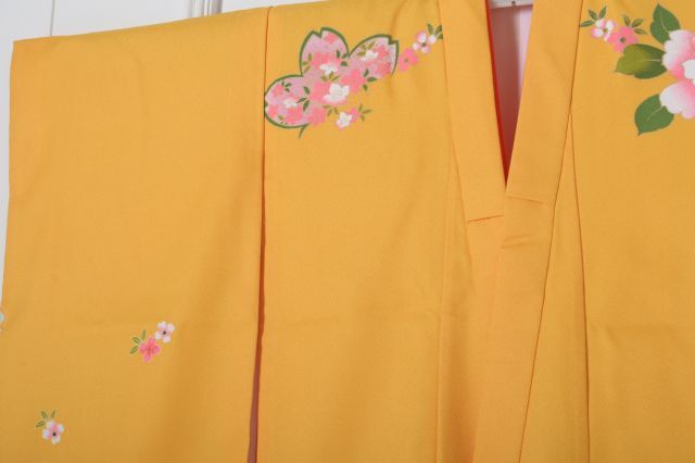 happy-outlet★七五三◇7歳◇子供着物◇女児着物◇中古品◇女児四つ身◇襦袢つき◇化繊◇からし色◇桜◇牡丹73-56