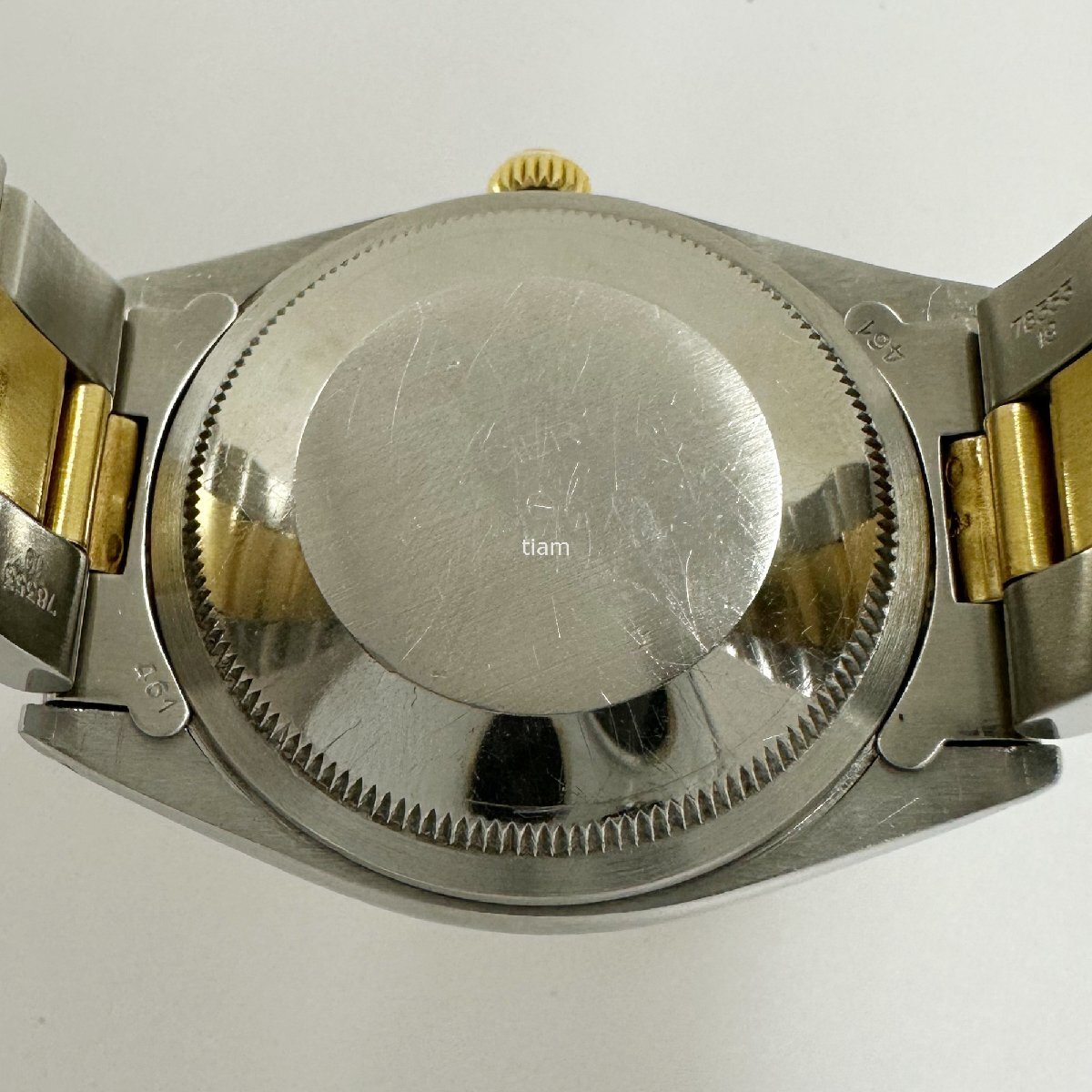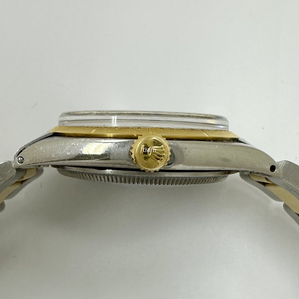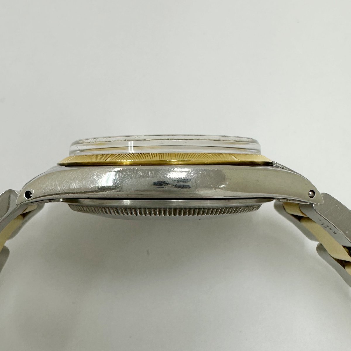 ガラス: 表面に傷がございます。 ダイヤル/針: 汚れ、シミがあり夜光が落ちています。針と王冠に変色がございます。 ケース/ベゼル: 小傷が多くございます。 ブレス: ヨレがございます。 その他: 裏蓋に刻印がございます。 | ||
